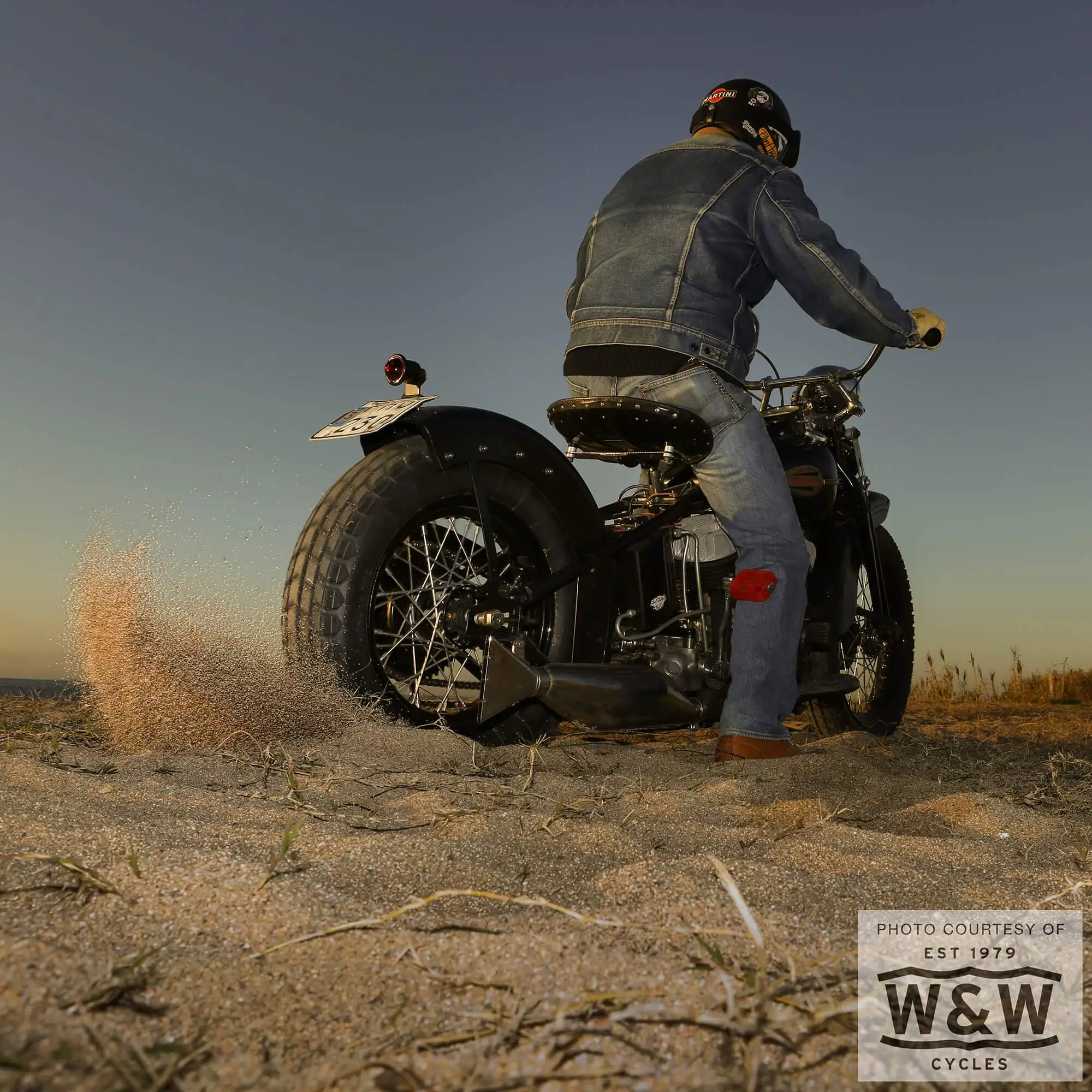 Gravel, rocks and roadkill – here’s a tire that knows no fear. Whistle into town, come back across the fields Steve McQueen style. Do some racing among friends on the neighborhood dirt track. Or what about that camping trip to the other end of the world you’ve been postponing all those years? The new Bates Baja can handle it all.