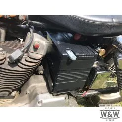 Modern gel or Li-Ion batteries offer a significant advantage – they are leak-proof. Those who ever experienced spilled acid in the battery tray, on the frame, on the swingarm, etc. will highly appreciate this fact. On the other hand, owners of classic bikes do like the looks of their original energy store and the corresponding cover and mounts. With a Bates BattBoy Battery Box you can have the best of both worlds, because what looks like a period 32 amp 12V accumulator on the outside can house a safe, modern battery within. Just hook it with two eyelet wires to the terminals on the bottom of the lid and you are all set. When using suitable Antigravity versions you even have storage room left for a few small spare parts, safety vest, emergency beer, etc. Ain´t this one heck of a cool solution for an old problem?