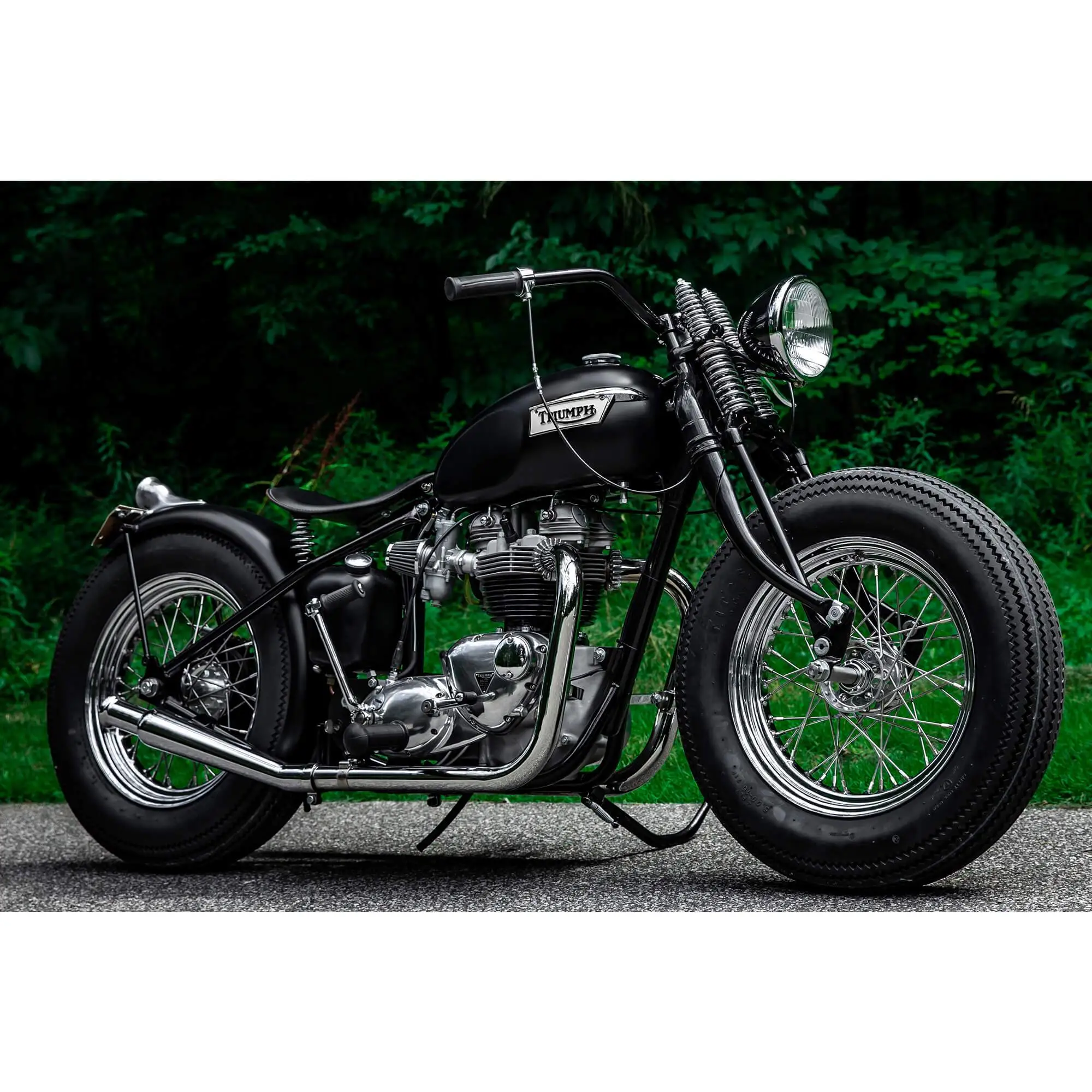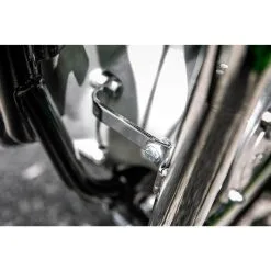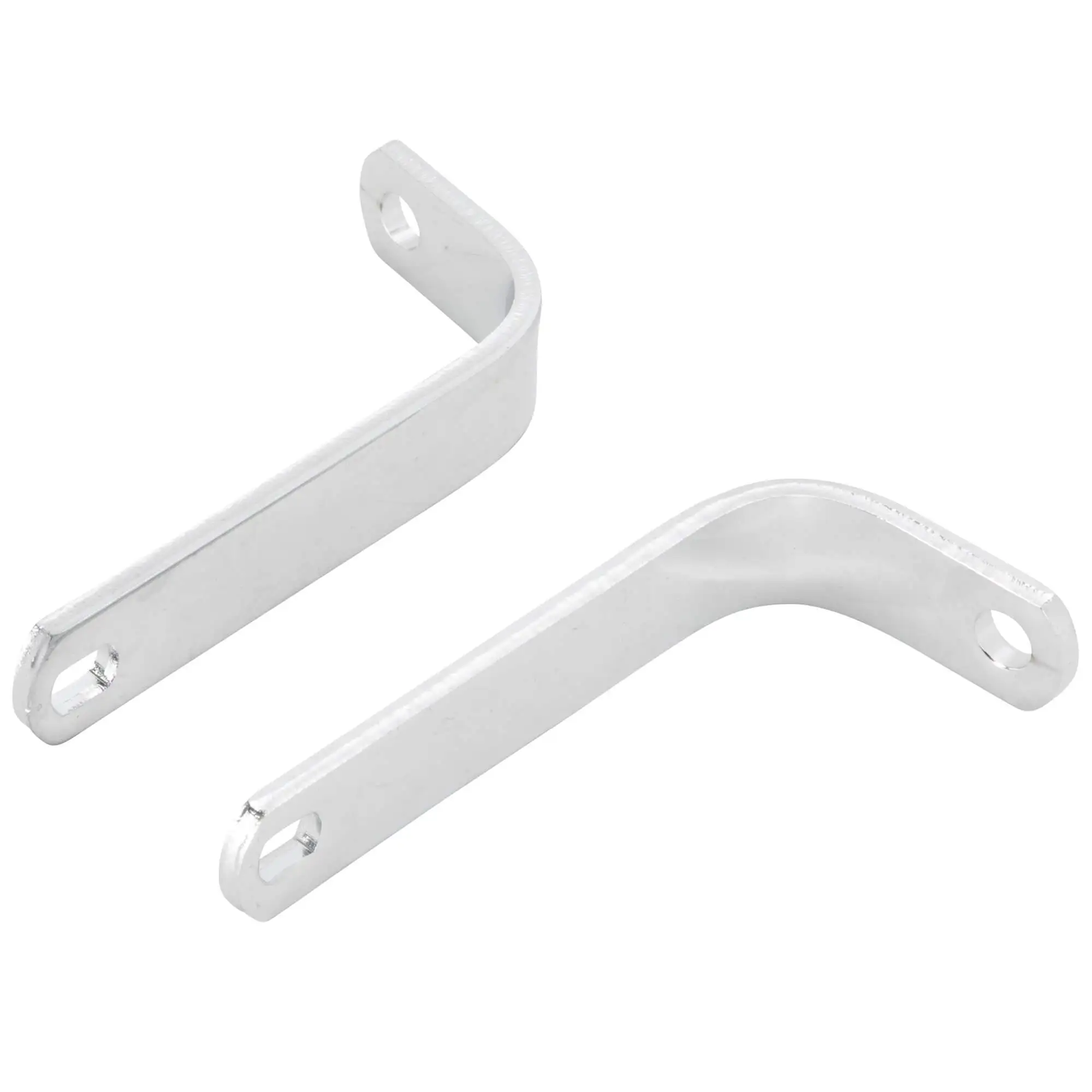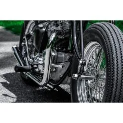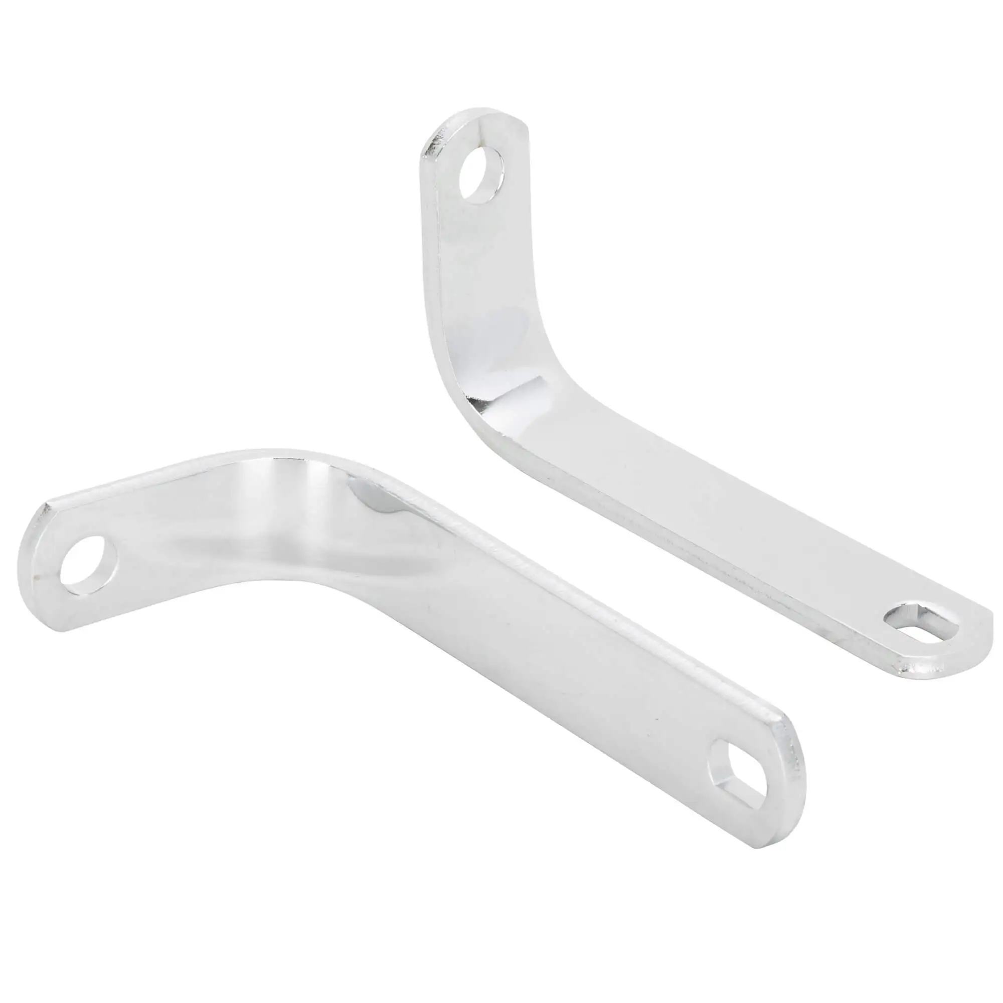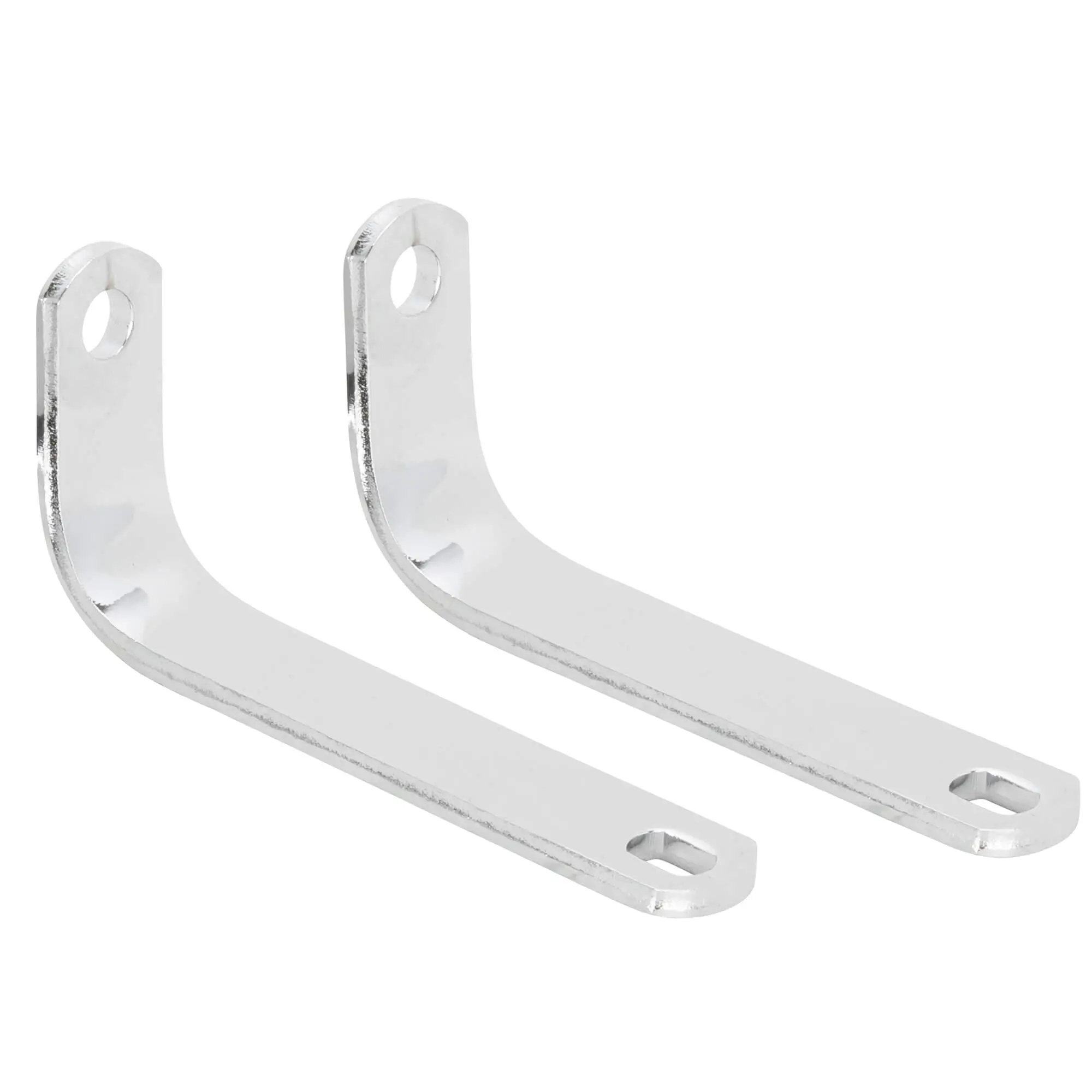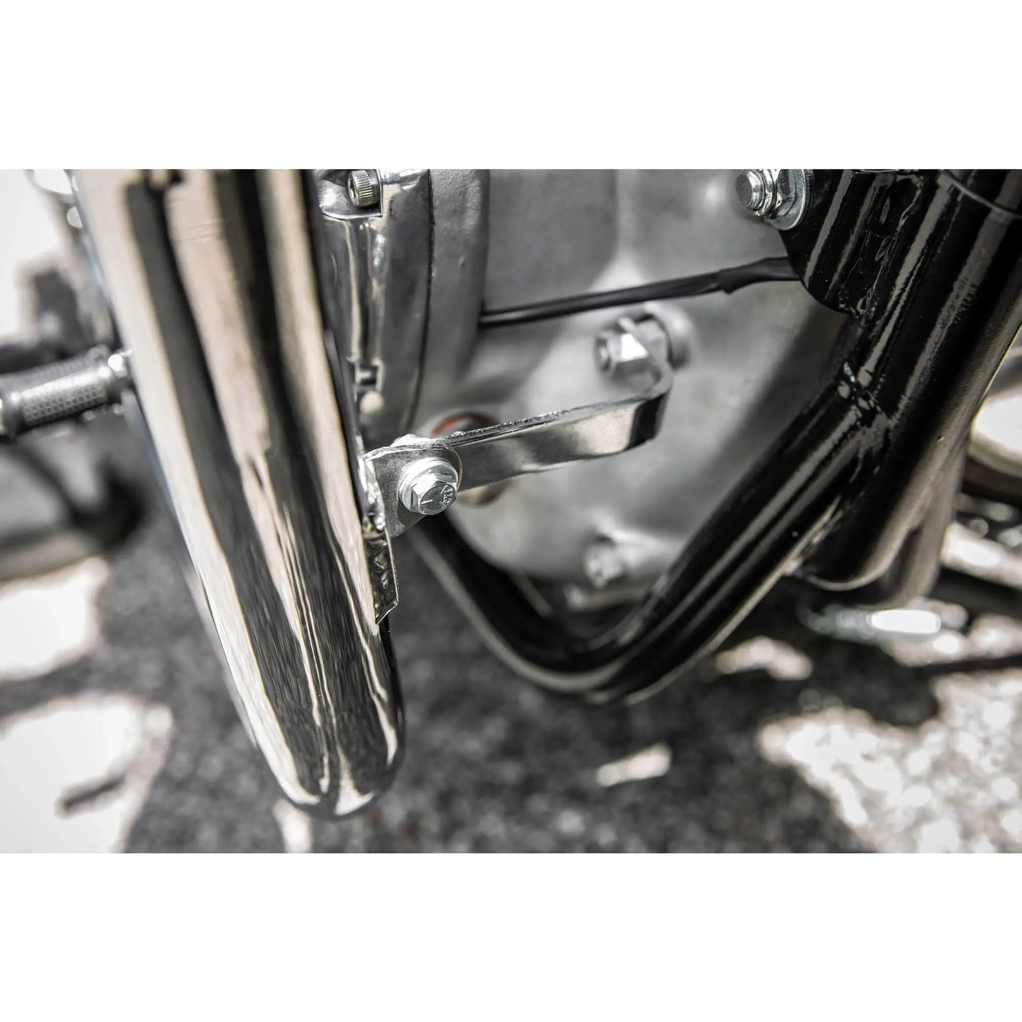 in chrome. They fit unit construction Triumph motorcycles, and bolt to the front crankcase bolt and then to your exhaust pipes that have tabs or threaded bungs for a nice sturdy pipe mounting. Check out the exhaust pipes we offer, most have these stock style tabs that will work great with these brackets! Sold per pair. Replacement for Triumph OEM # 70-6857