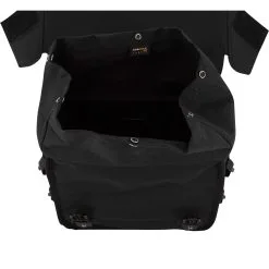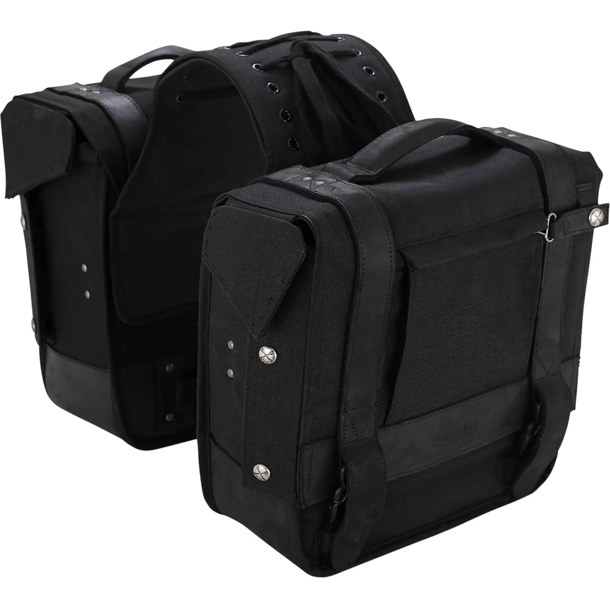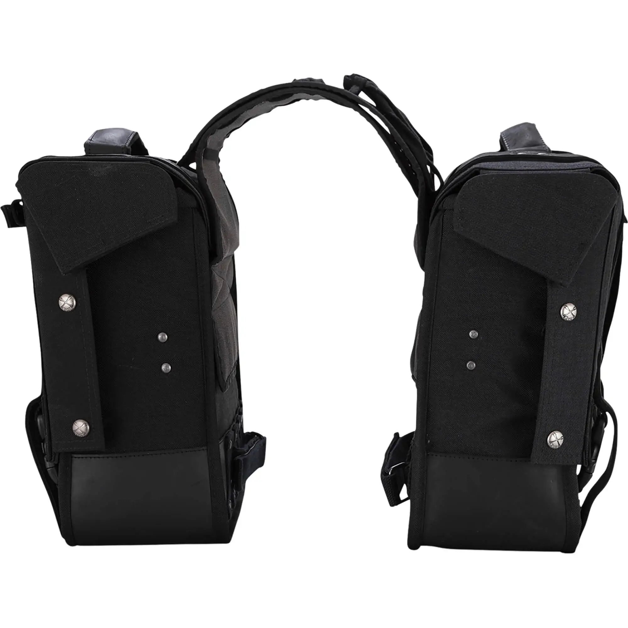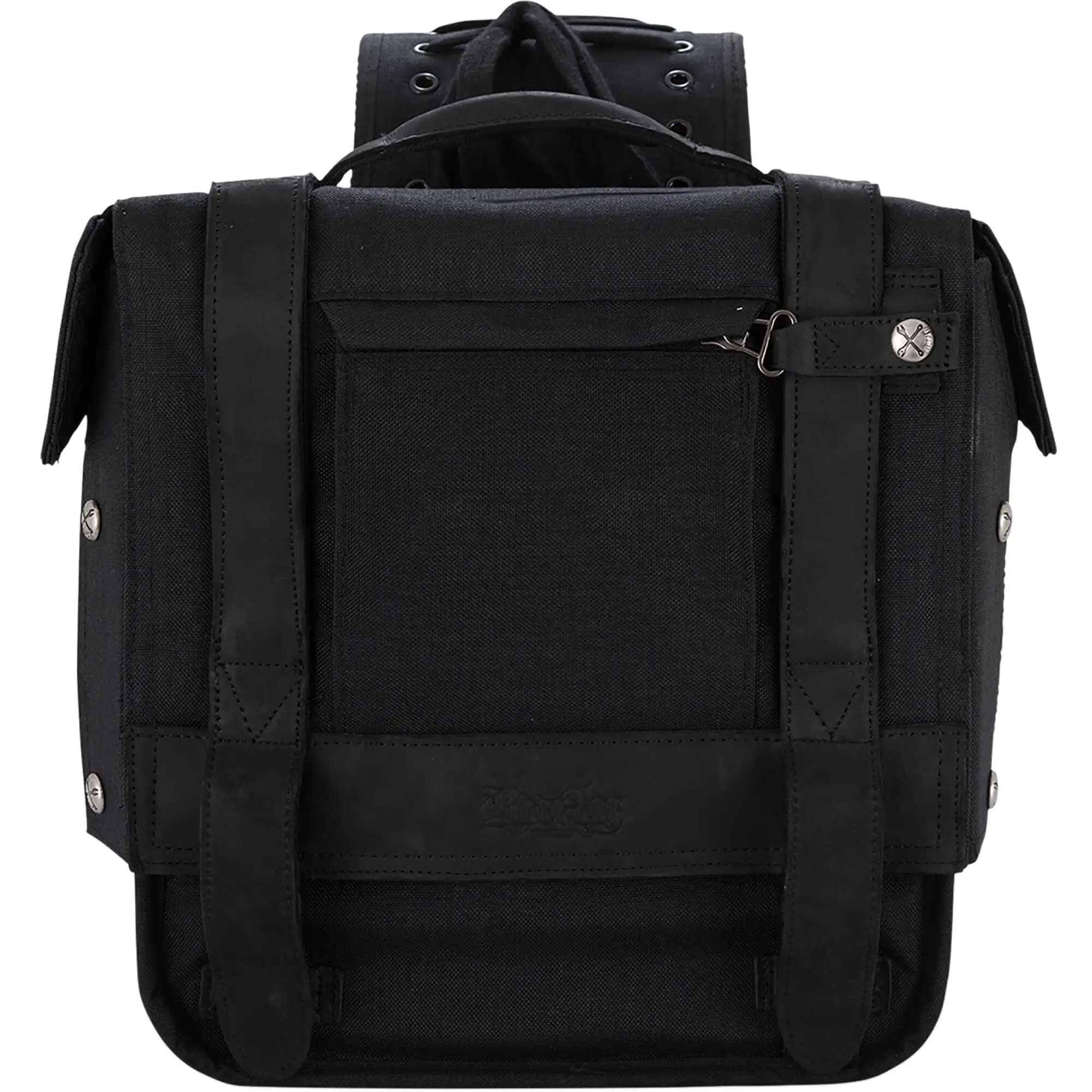 Burly Brand’s Throwover Saddlebags are available in the original Dark Oak Wet Waxed UV treated cotton canvas or Black CORDURA® and leather paneling for support that will age and show character over time. The roll-top Closure and Snap/Velcro Road Shield system keeps the wind and elements out. High quality “moto centric” speed buckles and zippers with metal Burly embossed button snaps and accents as well as an “Anti-Flail Snap System” keep everything secure. The saddlebags also feature an adjustable yoke center section that holds the two bags together. The yoke can be widened or narrowed to fit over your fender and adjusted to your bike via laces. The saddlebags allow you to take the bags off from your bike in less than 5 minutes. We recommend using