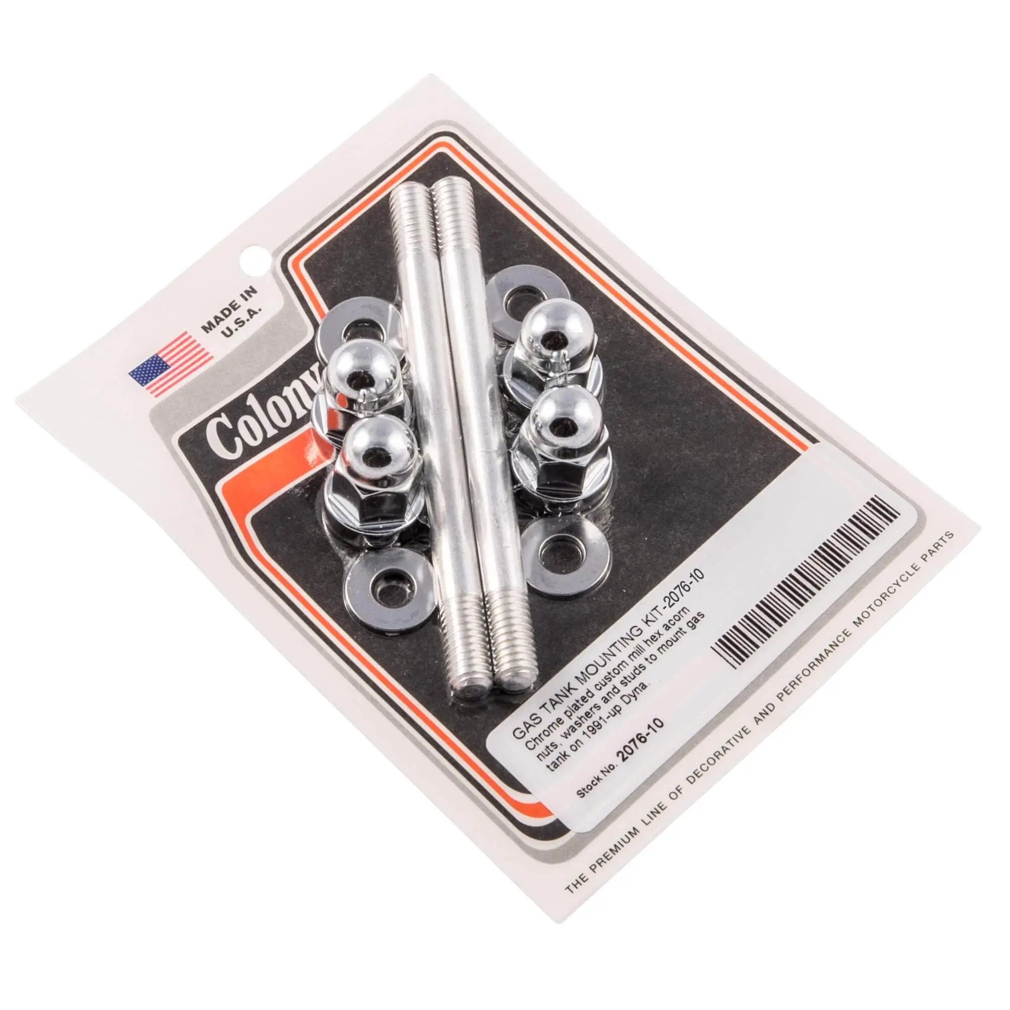 GAS TANK MOUNTING KIT Chrome plated custom mill hex acorn nuts, washers and studs to mount gas tank on 1991-up Dyna.