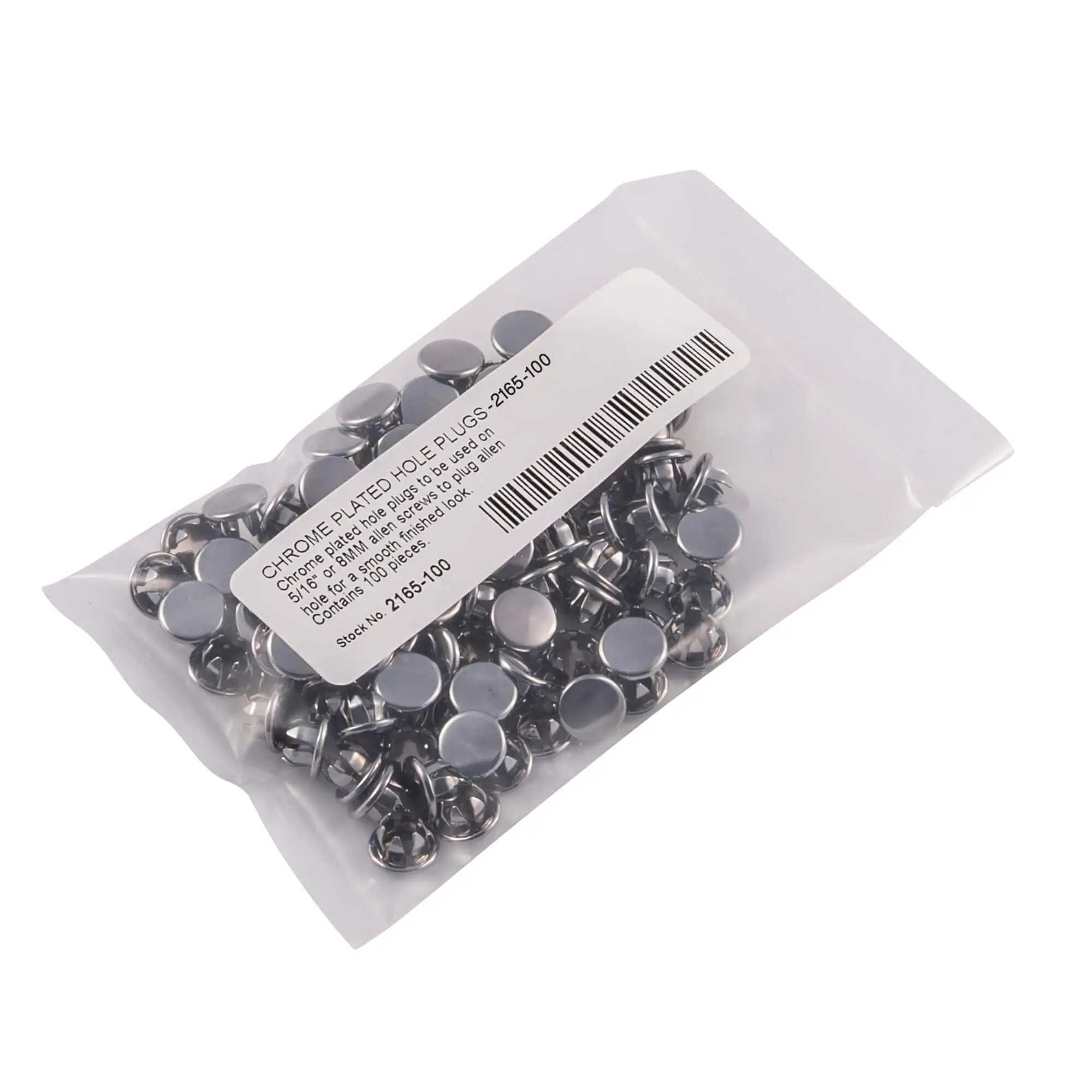 CHROME PLATED HOLE PLUGS Chrome plated hole plugs to be used on 5/16 inch or M8 / 8mm allen head bolts to plug allen hole for a smooth finished look. Contains 100 pieces. Made in the USA.