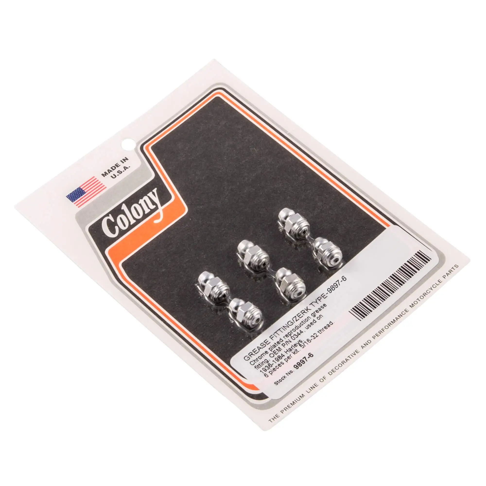 GREASE FITTING/ZERK TYPE Chrome plated reproduction grease fitting, OEM P/N 0344, used on 1936-1984 Harleys. 6 pieces per kit. 5/16-32 thread.