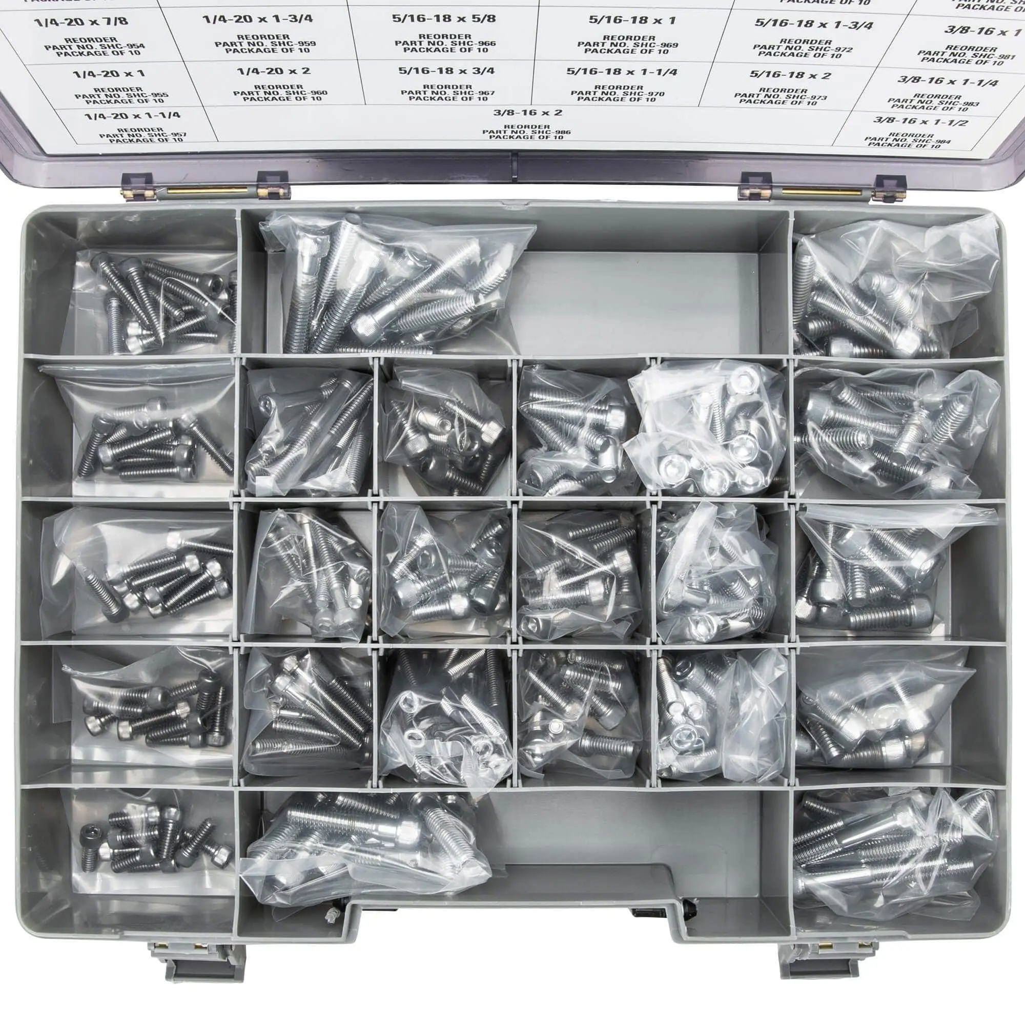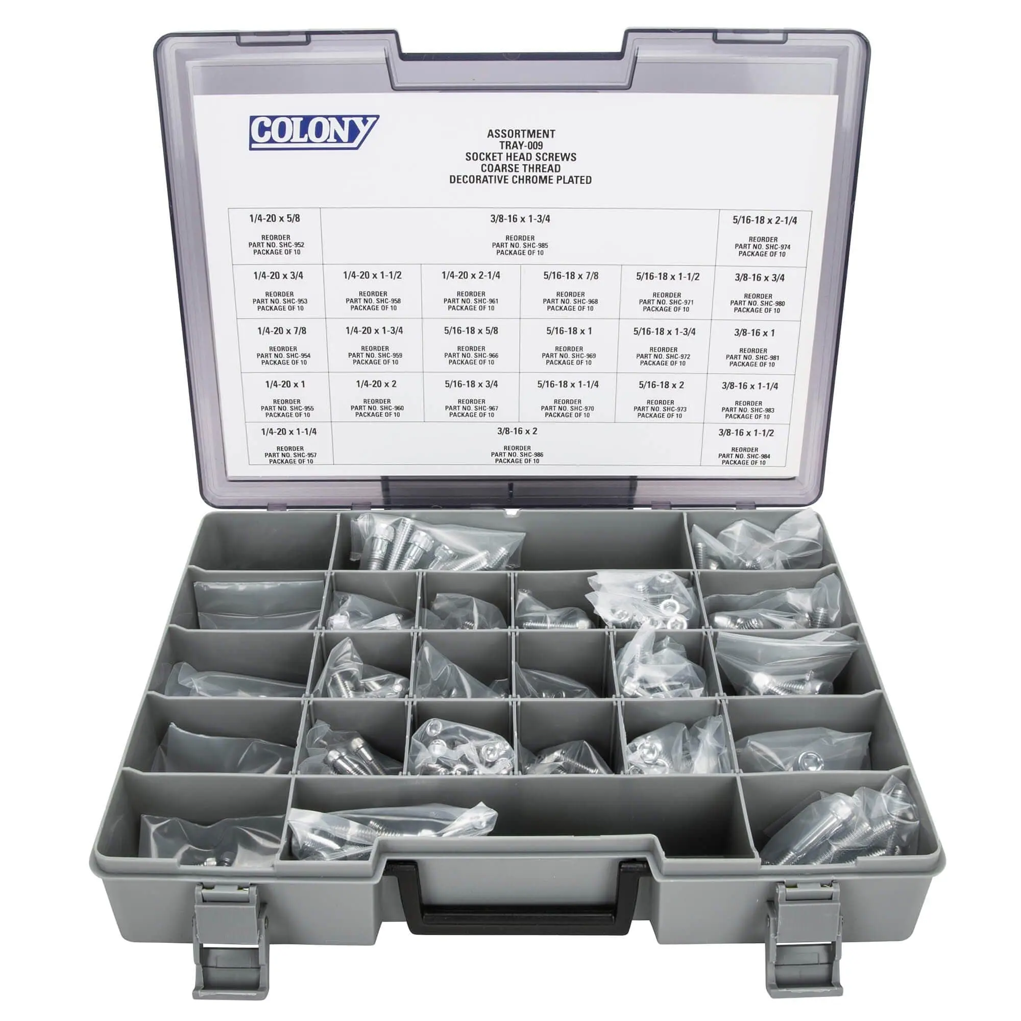 Complete assortment of chrome plated socket head screws, Coarse thread. 240 total pieces, Includes satchel style tray. Made in the USA.