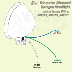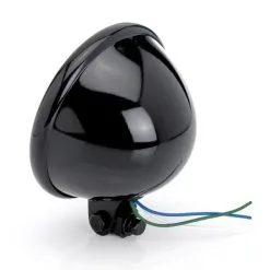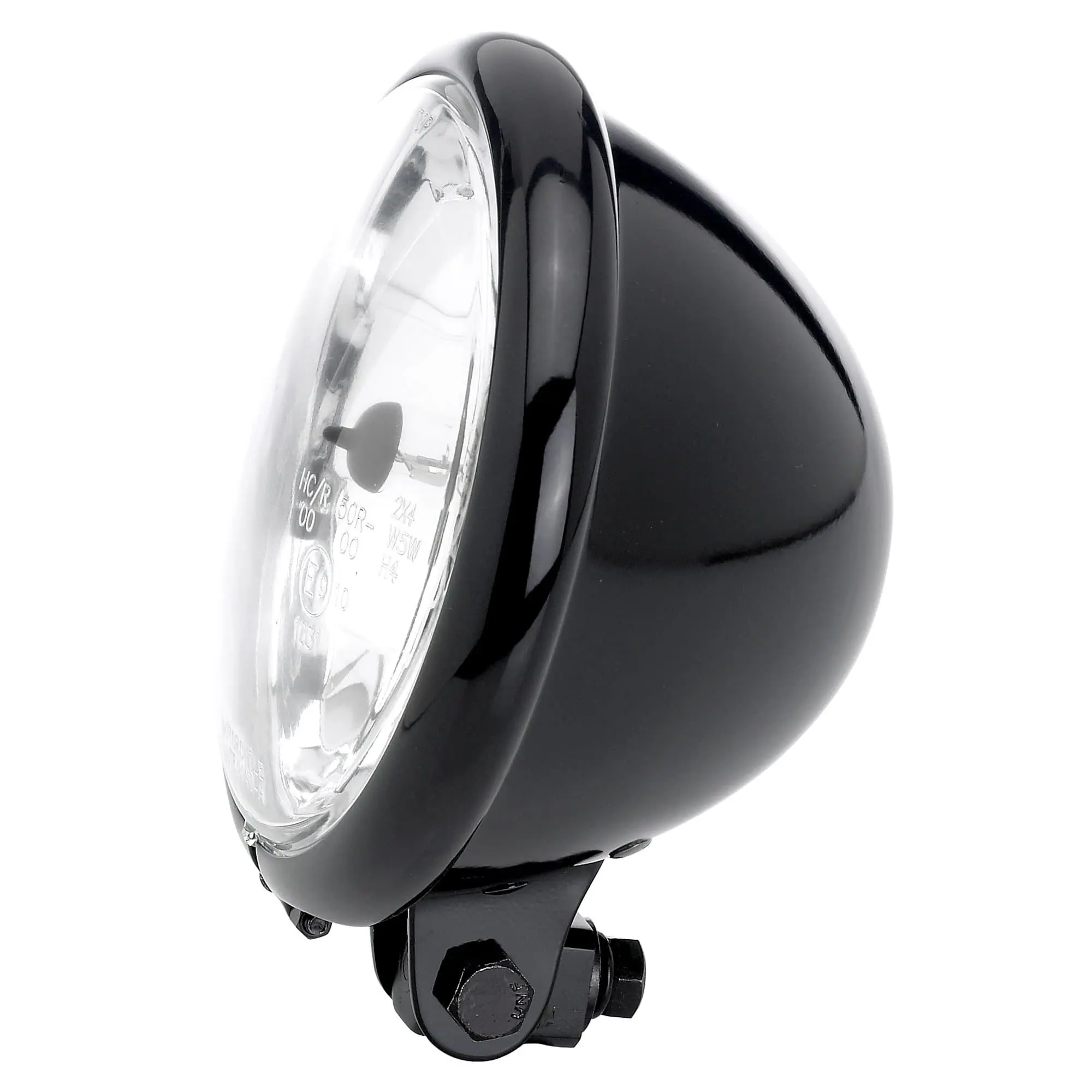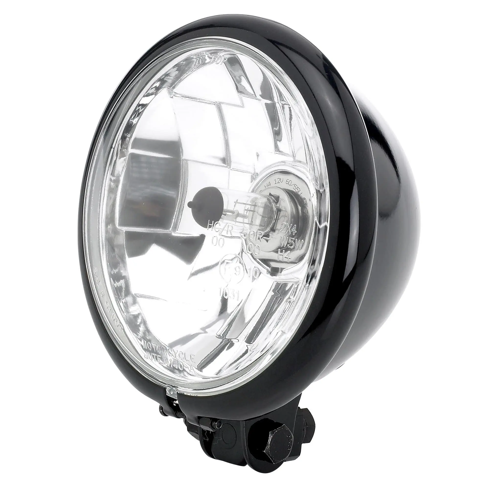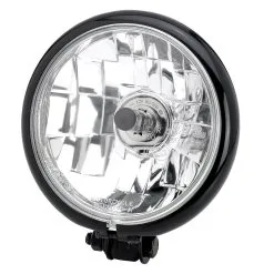 This bottom-mount headlight is 5-3/4″ diameter and features a swivel mount and a high / low beam halogen headlight for 12v systems. Clear lens with H4 halogen bulb, DOT approved. Best be sure your charging system is up to snuff on a vintage motorcycle to power the halogen bulb without an issue. Gloss Black.