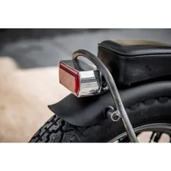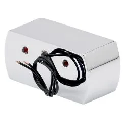 , the Box Tail Light is heavy-duty, die-cast steel that is beautifully chromed. 12 volt bulb provides running light, brake light, and license plate illumination via the clear window on the bottom of the light. Perfectly at home on a sissy bar or license plate mount. This light measures 4 1/4″ long, 2″ wide, and 2″ in height, and features two 5/16″-18 mounting holes.