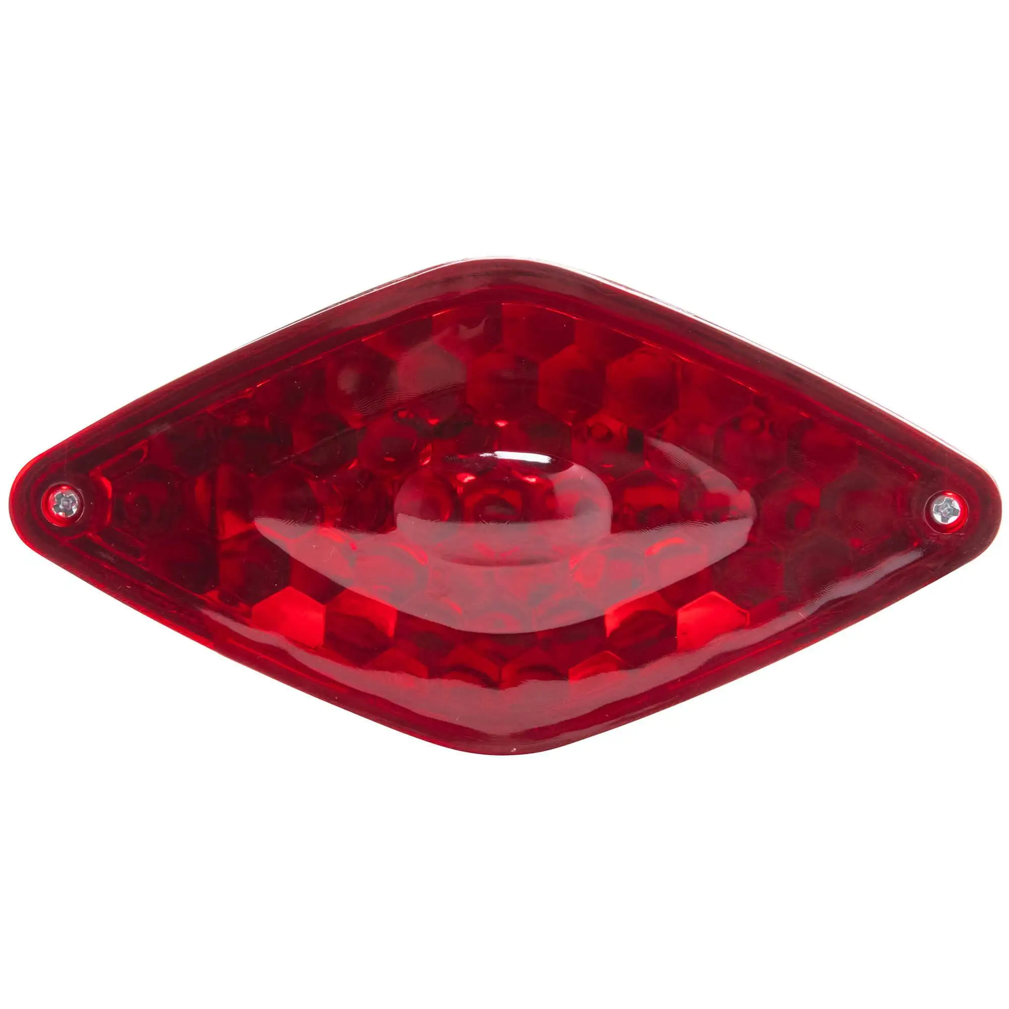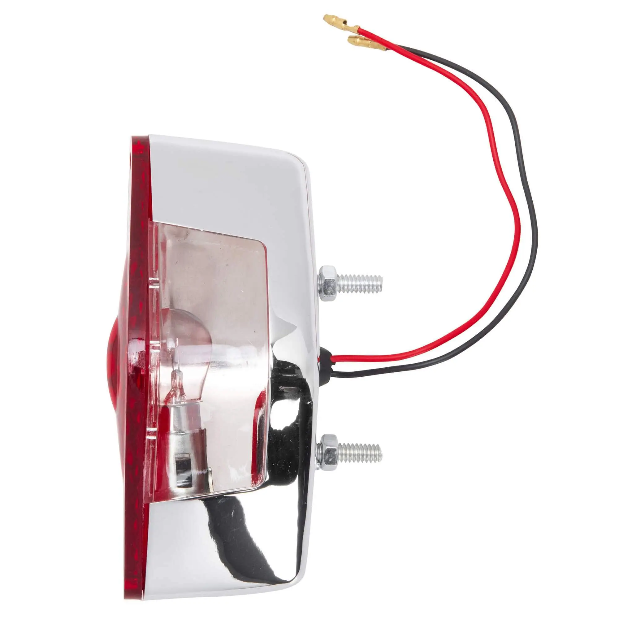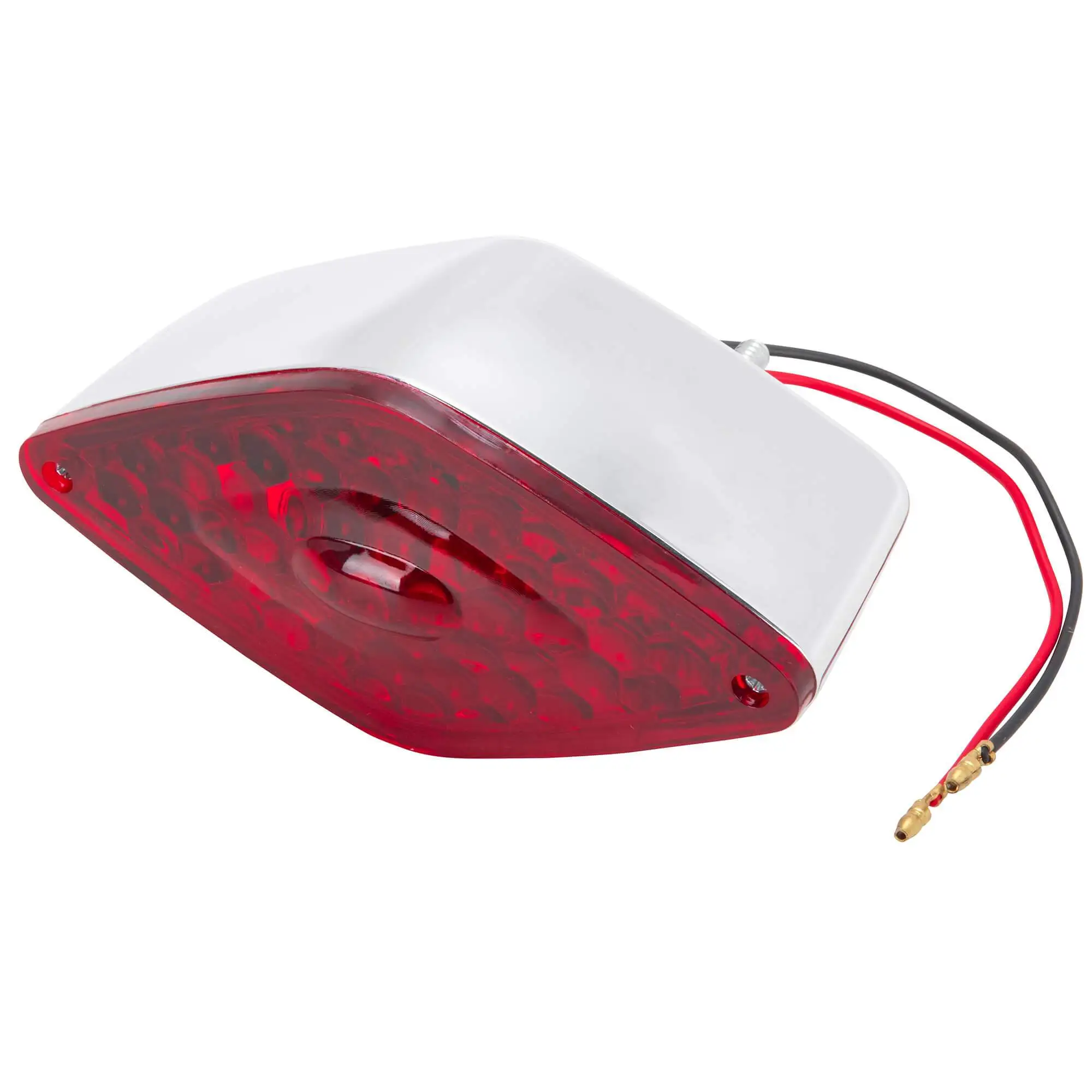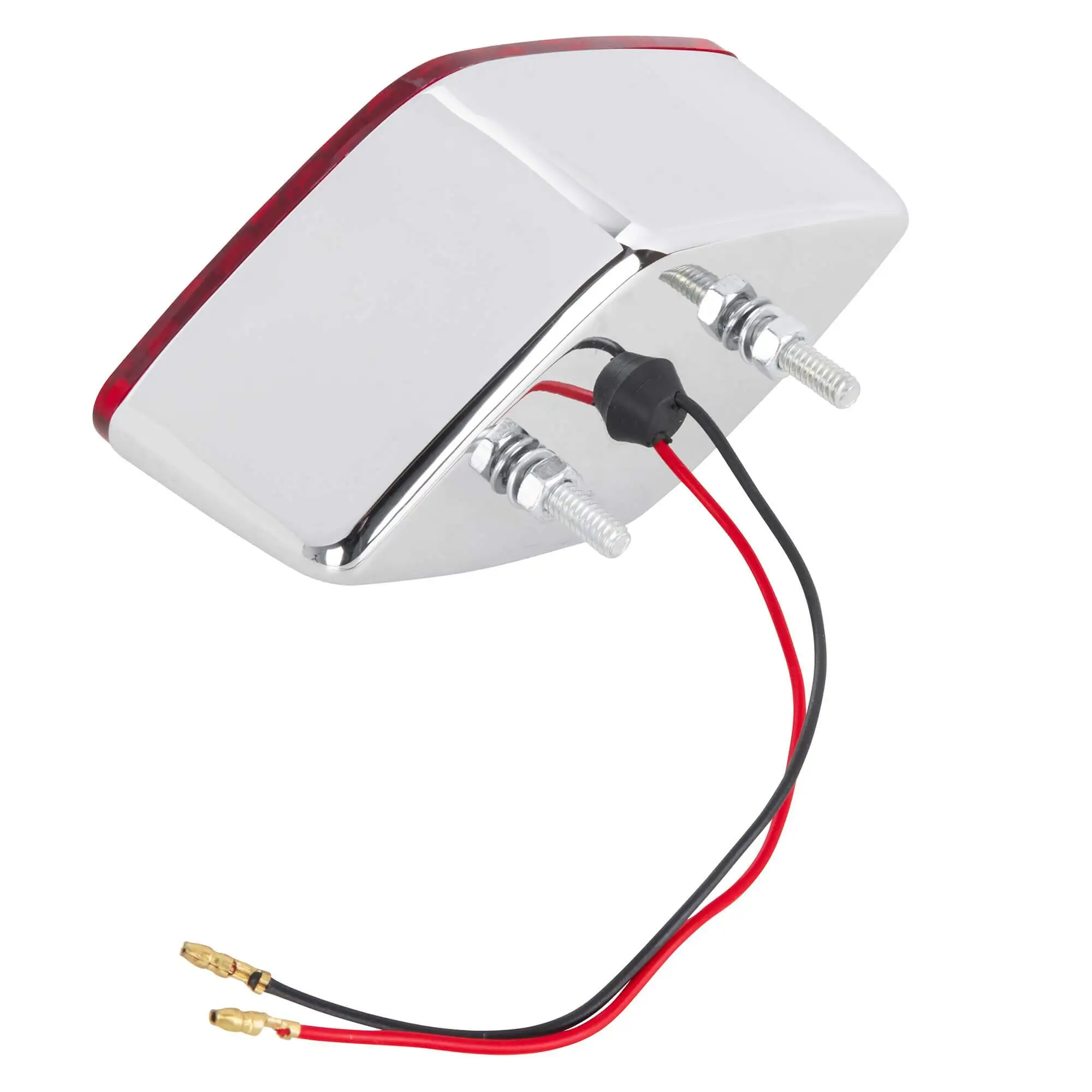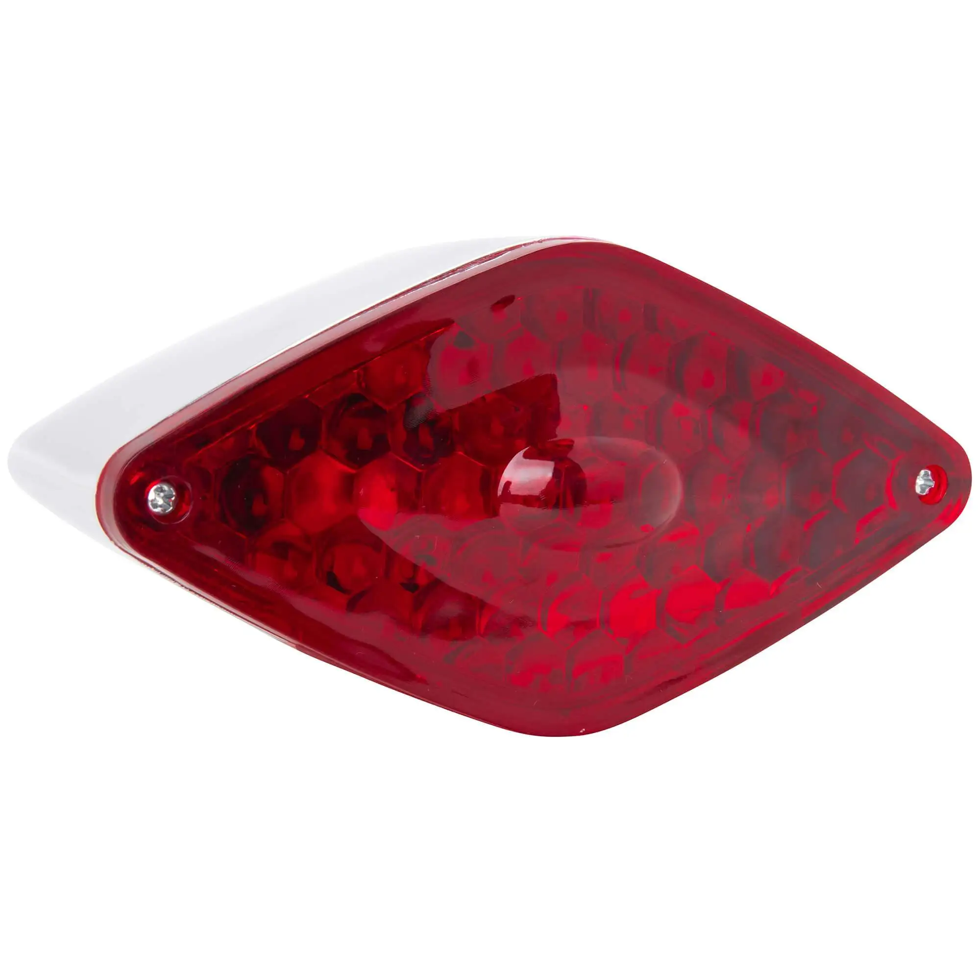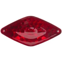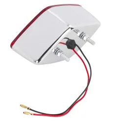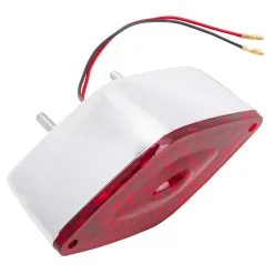 The Diamond Tail Light features two threaded studs for easy mounting on most flat surfaces. A 12 Volt 21/5 watt dual filament bulb allows this to be used as a running and brake light. Features a chromed plastic body, red acrylic lens, and a clear acrylic lens for license plate illumination. Measures 2-3/4″ high, 5-1/2″ wide and 2-1/4″ deep.