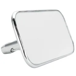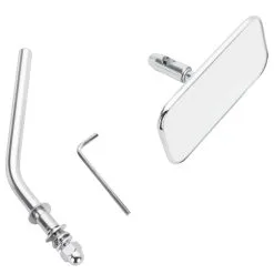 Need that mirror to stay legal, or clear up a fix-it ticket from the man? No billet, skulls, or LEDs here! This is a classic, compact square motorcycle mirror can be adjusted and mounted on either left or right hand side. The stem is 4″ long with 8mm x 1.0 threads, the mirror is a tidy 4-1/2 inches by 2-1/4 inches, and the whole assembly is chromed steel. Perch mount mirrors install in the mirror hole found on most hand controls, or can be used with a