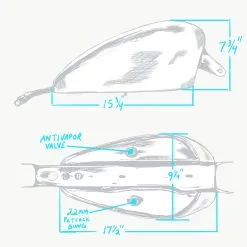 Β (Left side when sitting on bike), and a vent tube that is soldered shut. To run the vent tube just melt the solder out, though if you are running a vented gas cap this vent tube is not needed. The tank shells are stamped from 1mm (approx. 19 ga.) steel. Take a look at the photo gallery for the dimensions on this tank.