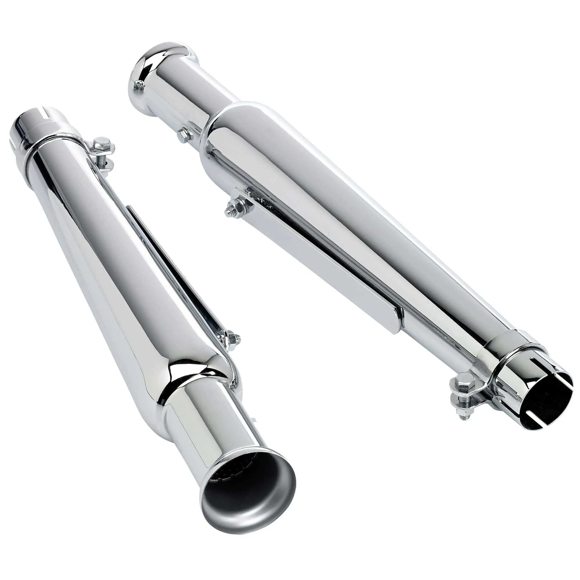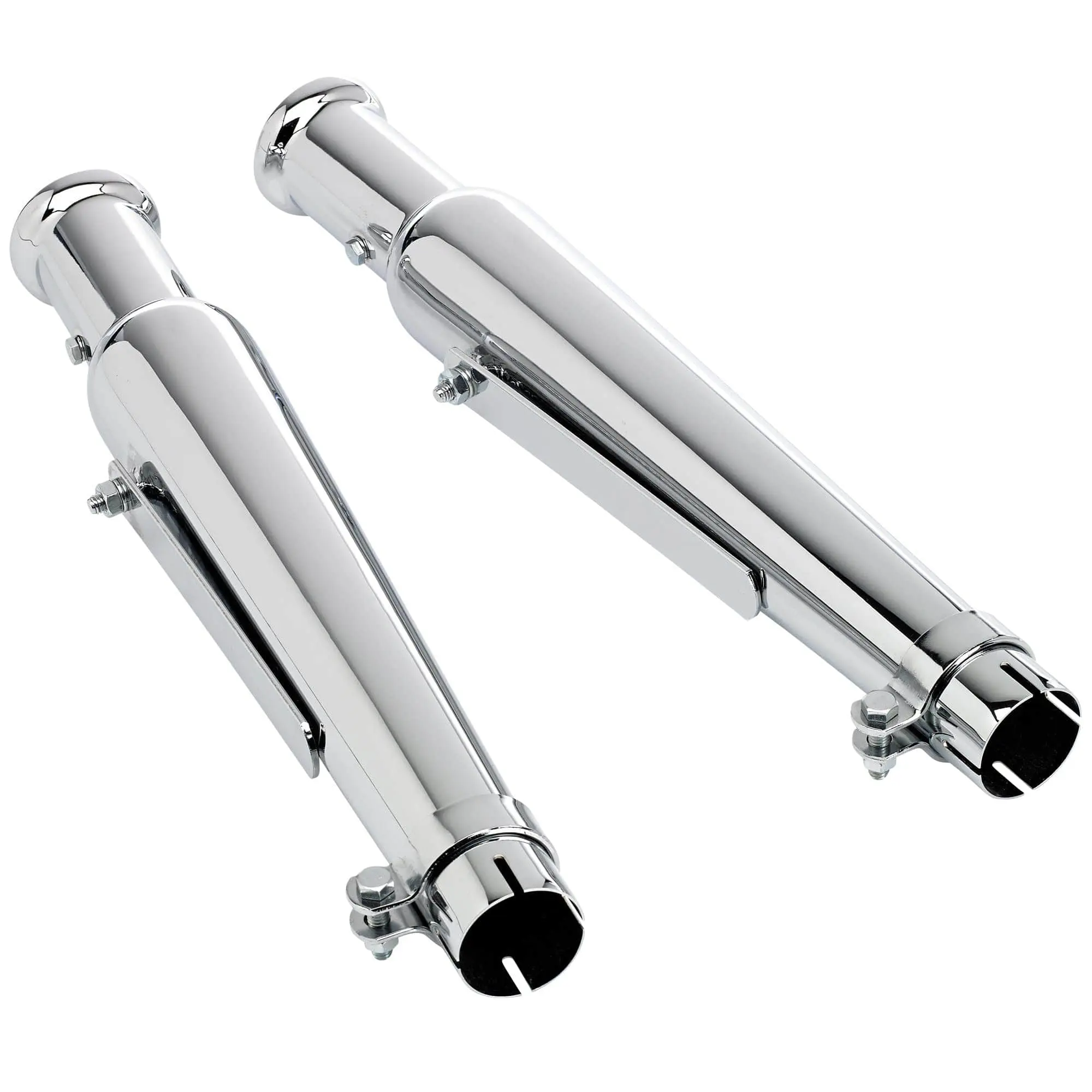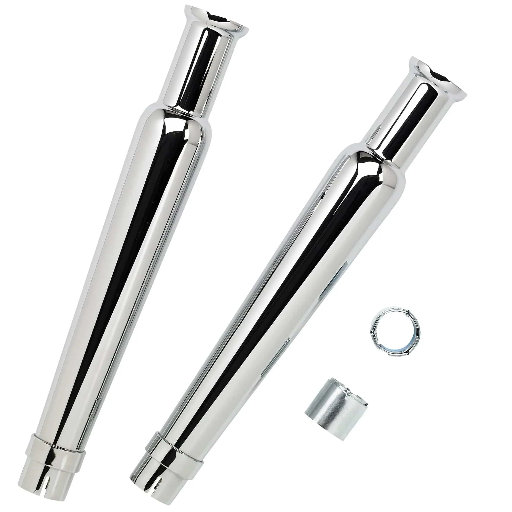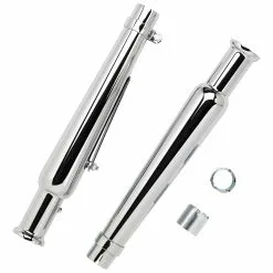 These cocktail shakers are 18-1/2″ long overall with a 7″ long mounting bracket. Includes a chrome exhaust clamp, these fit 1-3/4″ exhaust pipes. They also come with a set of adapters so you can run these on 1-1/2″ or 1-5/8″ exhaust pipes, as well as the 1-3/4″. These are are the same left and right so you can run one down each side of your bike or both on the same side. These have baffles which can be easily removed if you want. Sold in pairs as pictured.