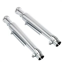 These cocktail shakers are 18-1/2″ long from the bend to the tip, and 20″ overall. The upsweep brings the tip up 5″. 7″ long mounting bracket. Includes a chrome exhaust clamp, these fit 1-3/4″ exhaust pipes. They also come with a set of adapters so you can run these on 1-1/2″ or 1-5/8″ exhaust pipes, as well as the 1-3/4″. These are a matching pair so you can run dual upswept mufflers on the Right side of the bike. These have baffles which can be easily removed if you want. Sold in pairs as pictured.
