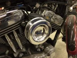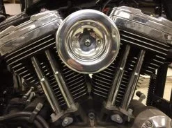 Gasbox introduces the new Dog Dish Air Cleaner. This air cleaner features a hand spun polished aluminum cover with a high quality element for high flow as well as superior protection from dust and dirt. This kit also includes a black powder backing plate and all necessary mounting hardware. A perfect fit on Harley-Davidson motorcycles (and others) with an S&S Super E or G carburetor. Diameter of Cover is 5-3/8″. Made in Cleveland, Ohio USA.