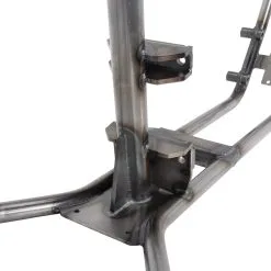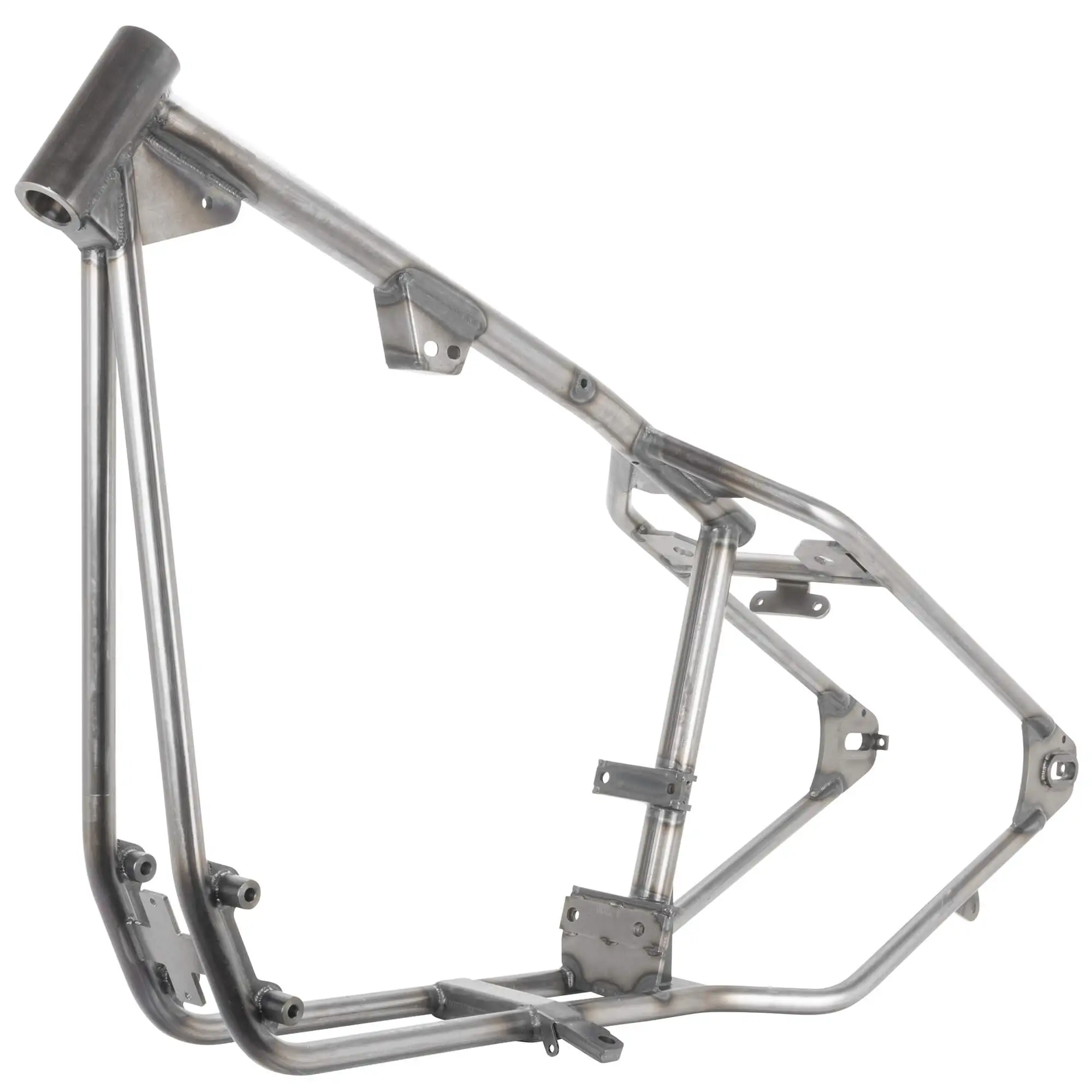 has approximately 4 inches of stretch and is set up to have 2 inches of drop. This means that with a front end and wheels on the bike the lower frame rails sit 2 inches closer to the ground than stock for that perfect stance. The axle plates are set up for a standard 3/4 inch rear axle and accepts a stock disc brake Sportster rear axle. This frame also features integrated upper mounts for