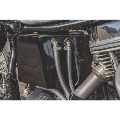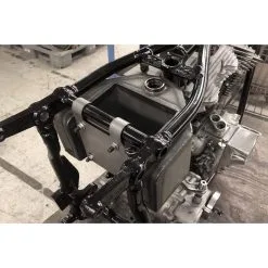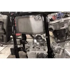 This tank is designed for a YTZ-14S battery, or one of similar size. This is the smallest electric start battery available other than Lithium Ion batteries (antigravity). The tank will also require the purchase of 1/8″ npt fittings of your choosing for the oil lines. Completely TIG welded and hand formed in Cleveland, Ohio.