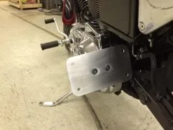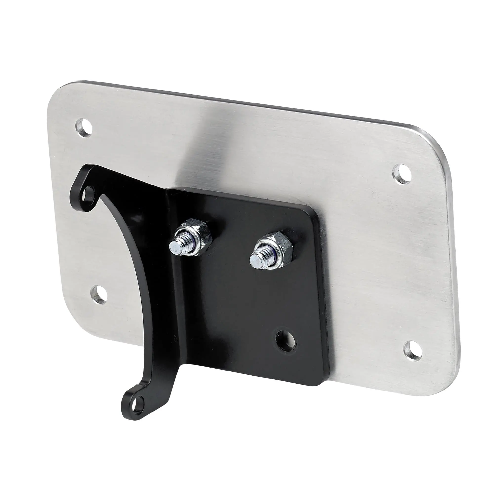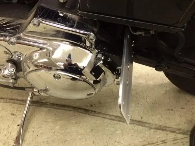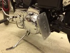 solutions we have seen for a Sportster. This mounts off the primary using the stock hardware. Just install the steel bracket (applying loctite to the bolts when re-installing) then attach the aluminum license plate bracket, either Vertical or Horizontal, with the supplied hardware. Super clean and tucked in. Made in Cleveland, Ohio USA.