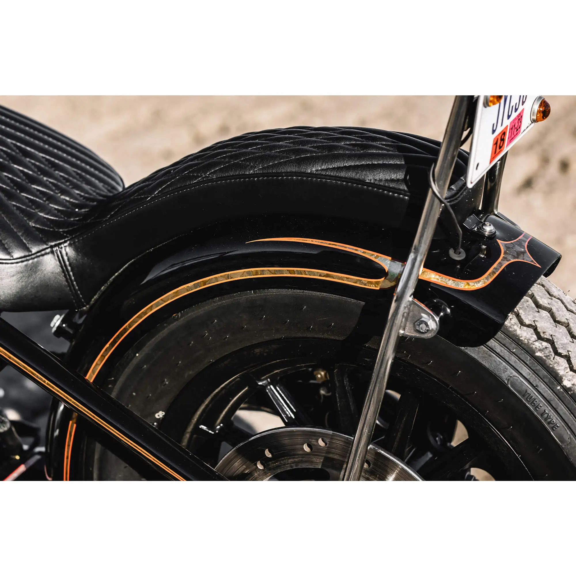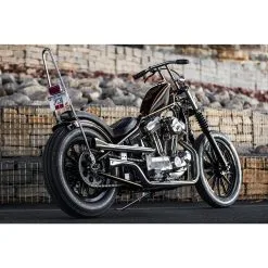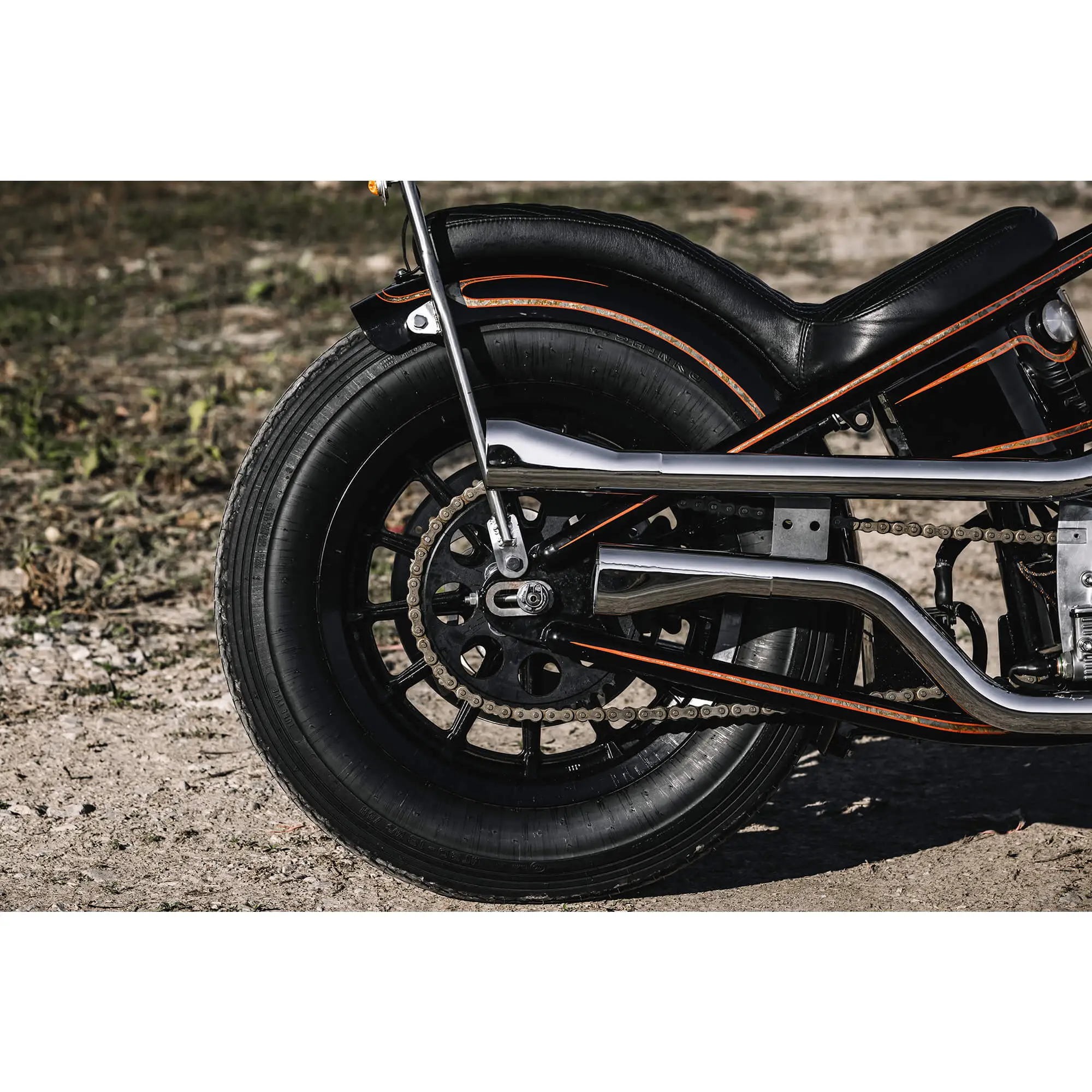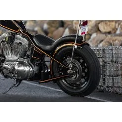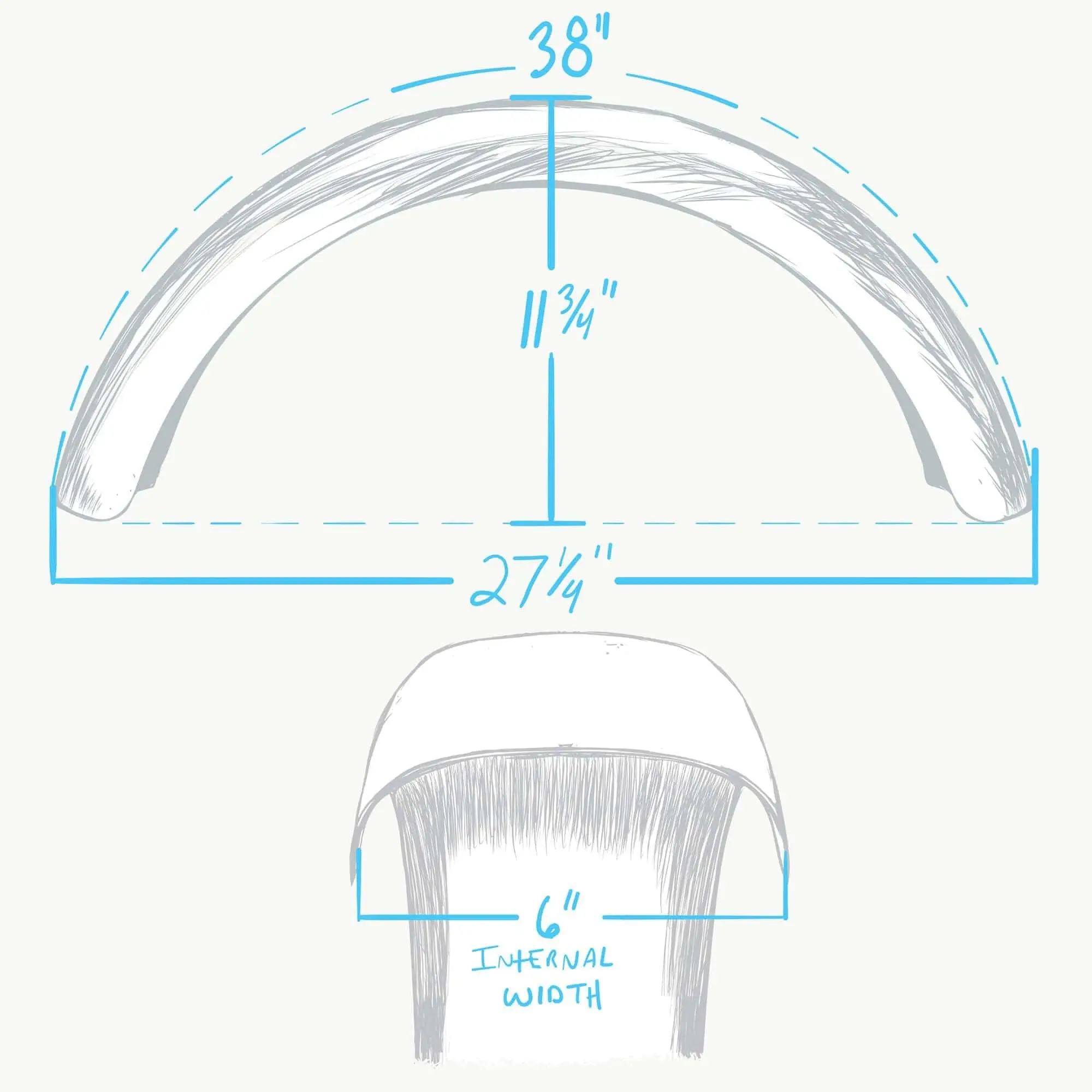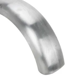 are a perfect fit for Avon MKII tires on 16″ rims (5.00-16″ tires) as well as other similar dimension vintage-style tires. They hug it close but with adequate clearance and follow the profile of the tire exactly. These have a bit more sidewall than many fenders allowing you to do something a bit different with your fender struts or sissy bar. 6″ internal width for more clearance for mounting hardware, 27-1/4″ diameter measured straight across tip to tip. The fenders are approximately 12 gauge steel, no flimsy fenders here!