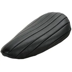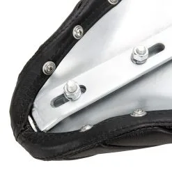 This seat features a genuine leather cover sewn into a tuck n roll pattern atop of 1″ of high density memory padding. The seat pan is constructed from 16 gauge steel with a zinc coated finish. The overall length is 14″, overall width is 9″, and the spring mounts are 6″ on center. Made in the USA.