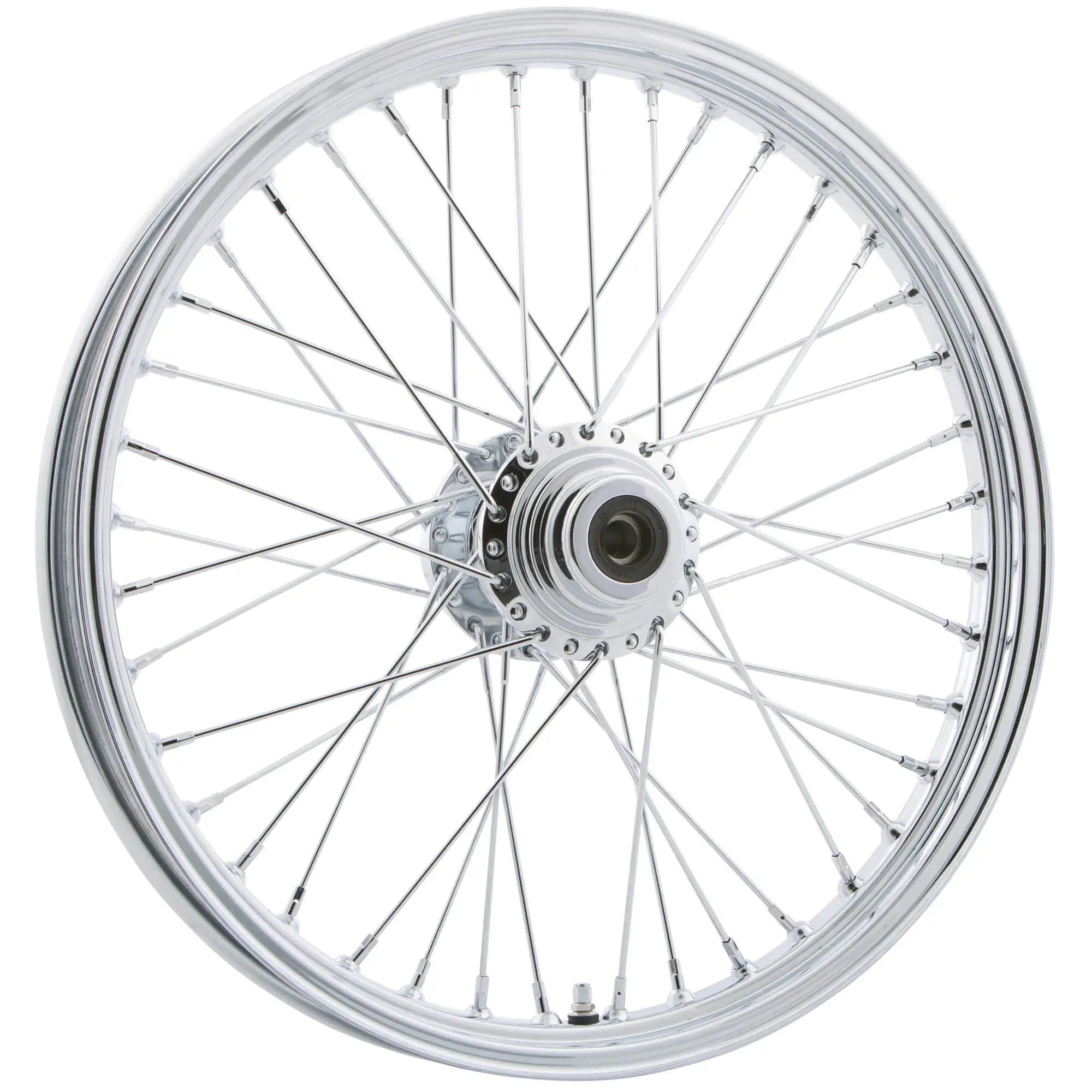 HardDrive Gloss Black and Chrome Spoked wheels are laced in a standard 40-Spoke pattern. Wheels come complete with spoke sealant, Chrome valve stem, inner sleeve and sealed wheel bearings (except the `84-99 fitment which comes with ¾” Timken bearings with an outer seal installed – greasing is required)