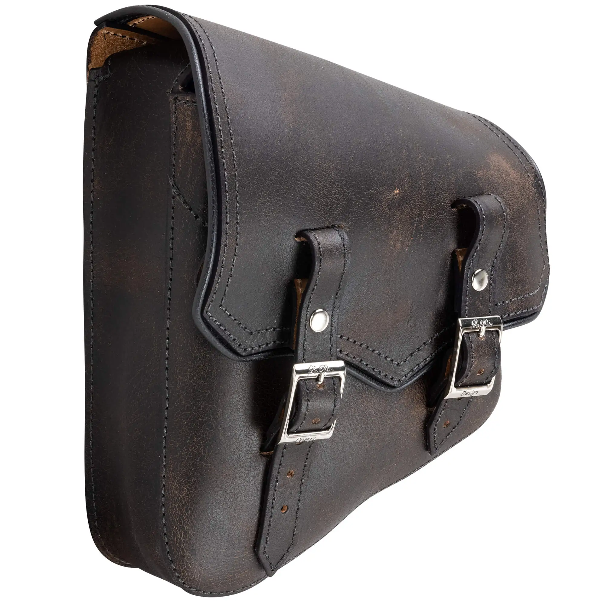 These solo saddlebags are crafted in the U.S.A., handmade from heavyweight leather. Available in everyone’s favorite color, black, with black stitching. These are a rustic black for a vintage look. These strap onto the left side of your rigid or Softail motorcycle frame, and are a convenient place to stash some gear for a ride. Featuring heavy-duty straps with traditional roller buckles, just like they have been made since the beginning. The solo bag measures 14″ high at the front, 7″ high at the rear, 11″ wide and 3-1/2″ deep. For Left Side (as if sitting on bike).