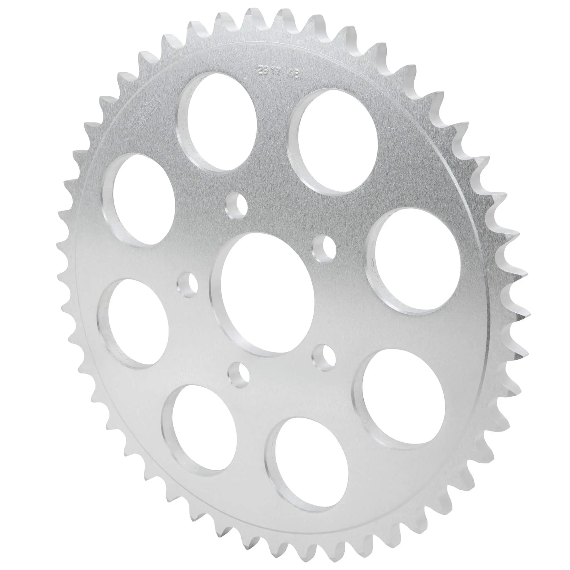 This kit is designed to match stock gearing for 1995-2003 1200 Sportsters. The countershaft (front) sprocket is 23 teeth, and the rear sprocket is 48 teeth, for a 2.09:1 gearing ratio. This means that the countershaft sprocket rotates 2.09 times to spin the rear sprocket one full revolution. The less times the countershaft sprocket has to rotate, the taller the gearing, meaning less power off the line but better high-speed cruising. The 1995-1999 rear sprocket has a 1.985 inch diameter center hole and the 2000-2003 rear sprocket has a 2.214 inch diameter hole to properly fit the stock 1200 Sportster rear wheel.