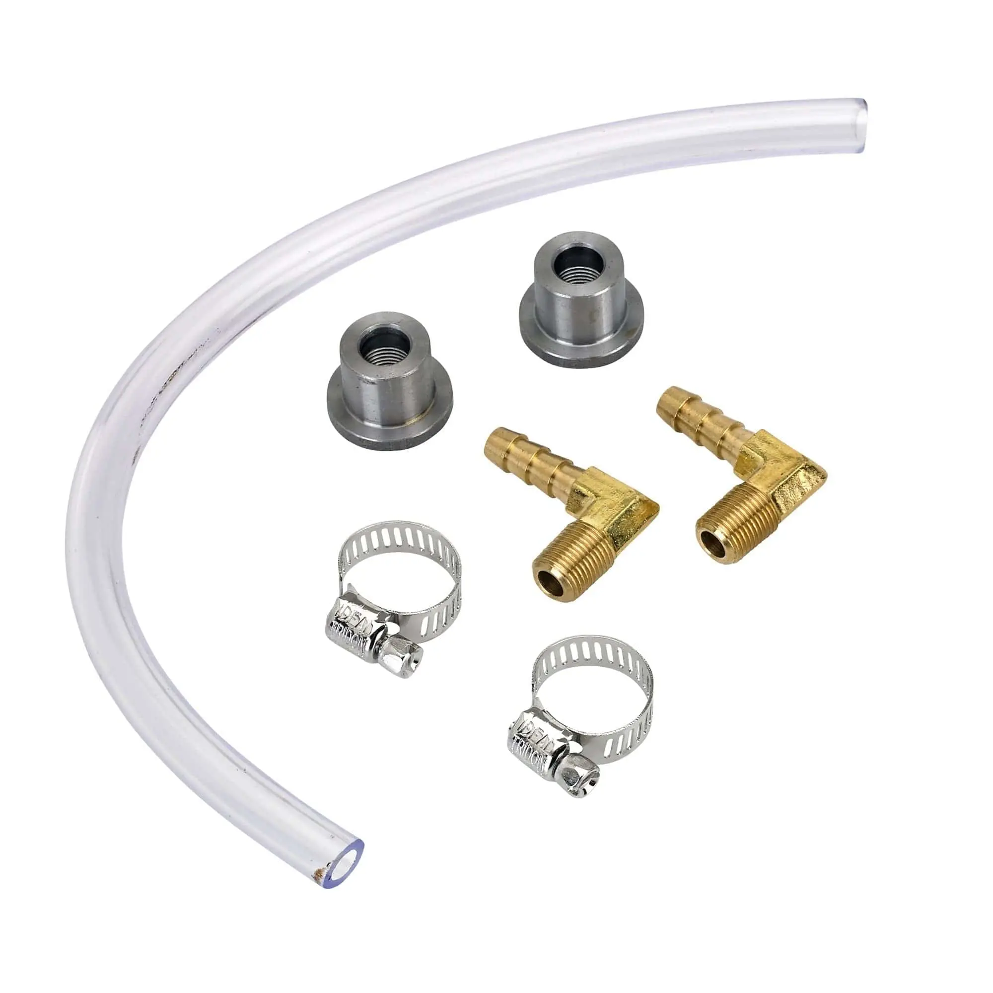 The DIY Gas Tank Fuel Sight Gauge Kit from Lowbrow Customs. What makes our kit different than others available? Start with the smooth Brass 90 degree fittings, 1/8″ NPT x 1/4″ hose barb, made in the USA. Mild steel tophat 1/8″ NPT bungs, easy to weld, drill a 5/8″ hole and drop them in and they held in place perfectly by the flange. Stainless steel hose clamps with stainless screw, made in the USA, and then polished to a show quality finish. 12″ of high-quality 1/4″ ID polyurethane clear fuel line, this is very flexible and has excellent fade and abrasion resistance.