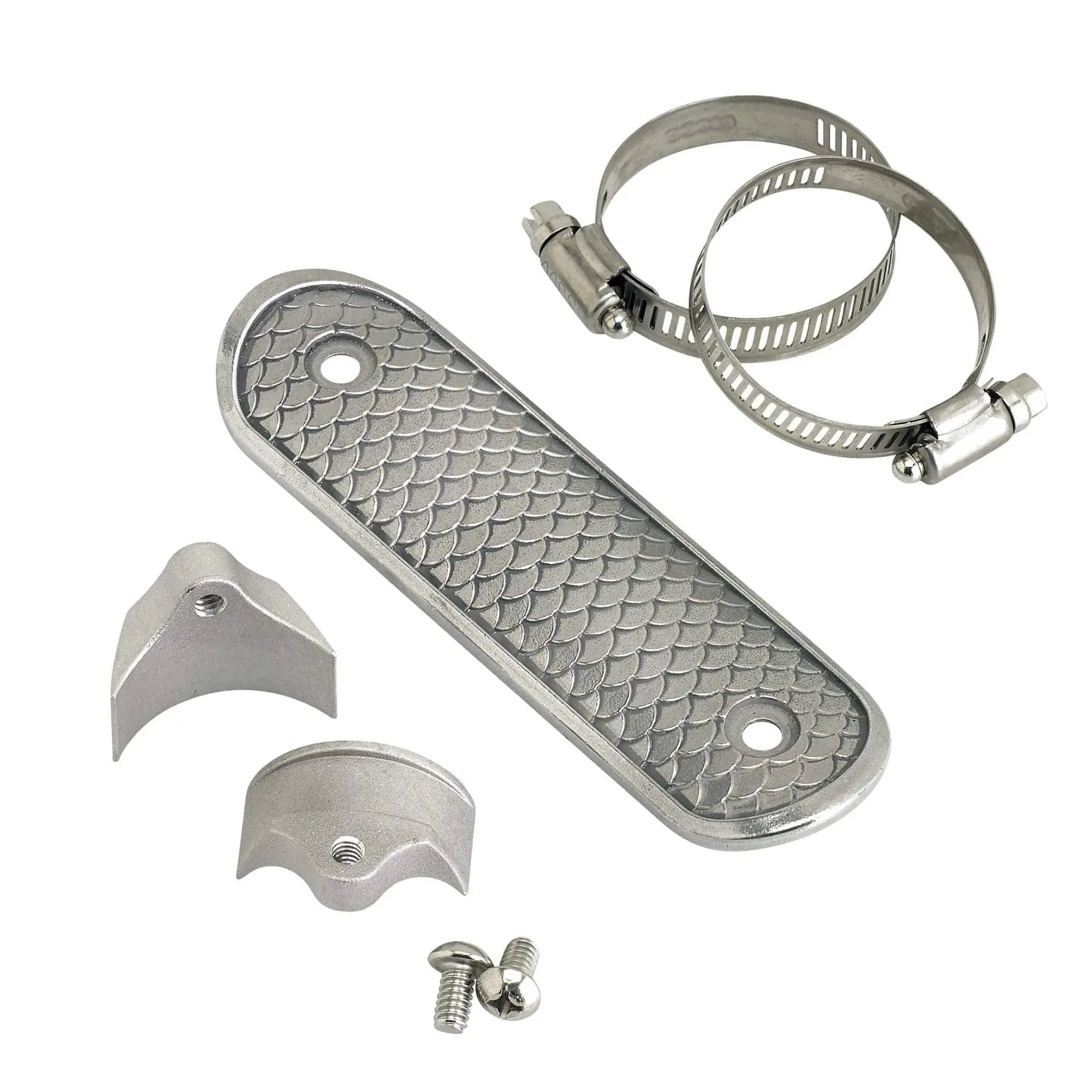 Protect your legs in style with investment-cast aluminum heat shields from Lowbrow Customs. Available in a semi-polished aluminum finish. The innovative cast aluminum mounts are coped perfectly for 1-3/4″ exhausts, and work with 2″ (minor filing of mounts necessary) and 1-1/2″ exhausts as well. The included stainless steel hose clamps hold the mounts in place on your exhaust, and the supplied stainless steel screws mount your 6″ or 12″ heat shield securely in place with no welding or fabrication required. In your choice of Finned, Fish Scale, or Smooth.