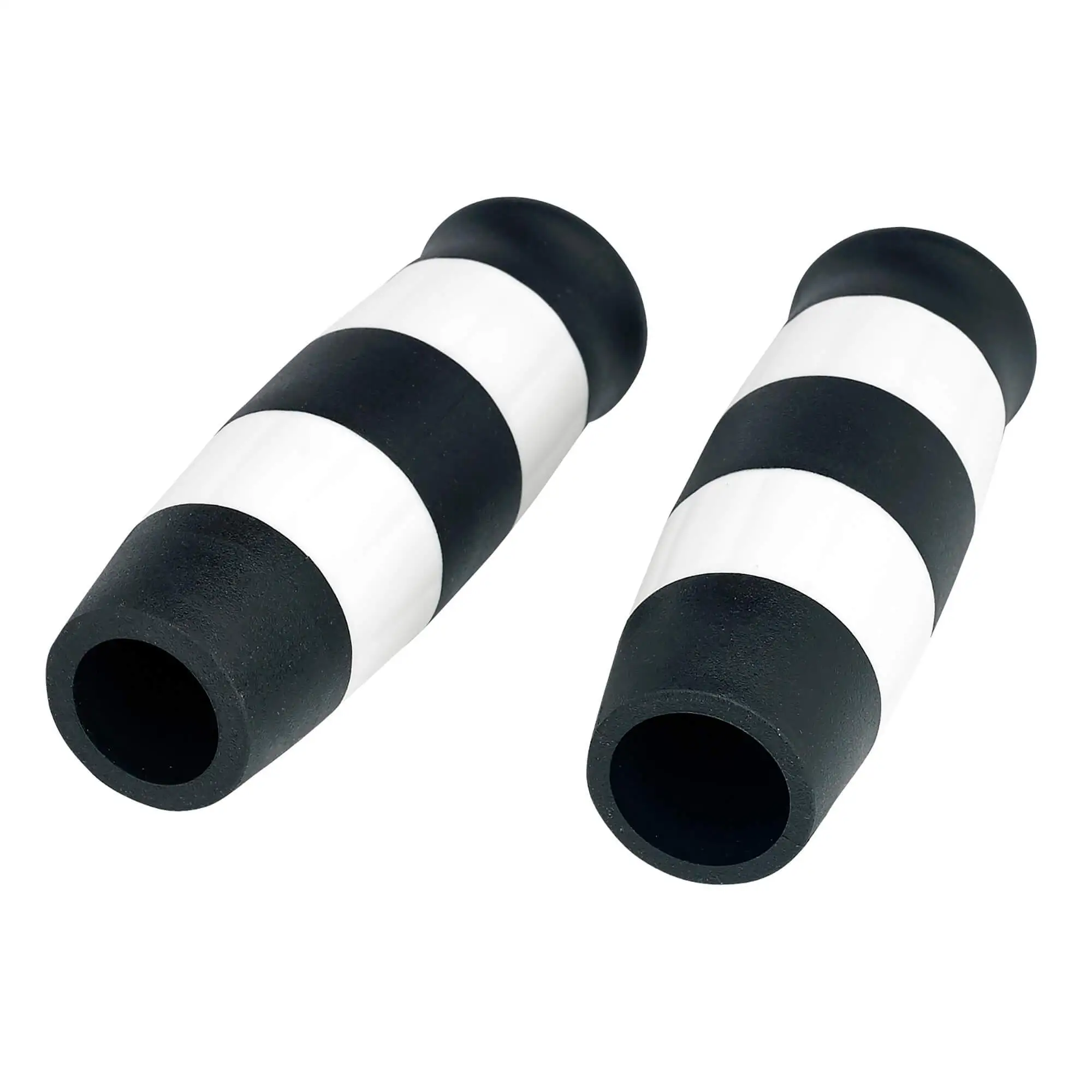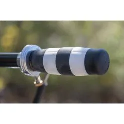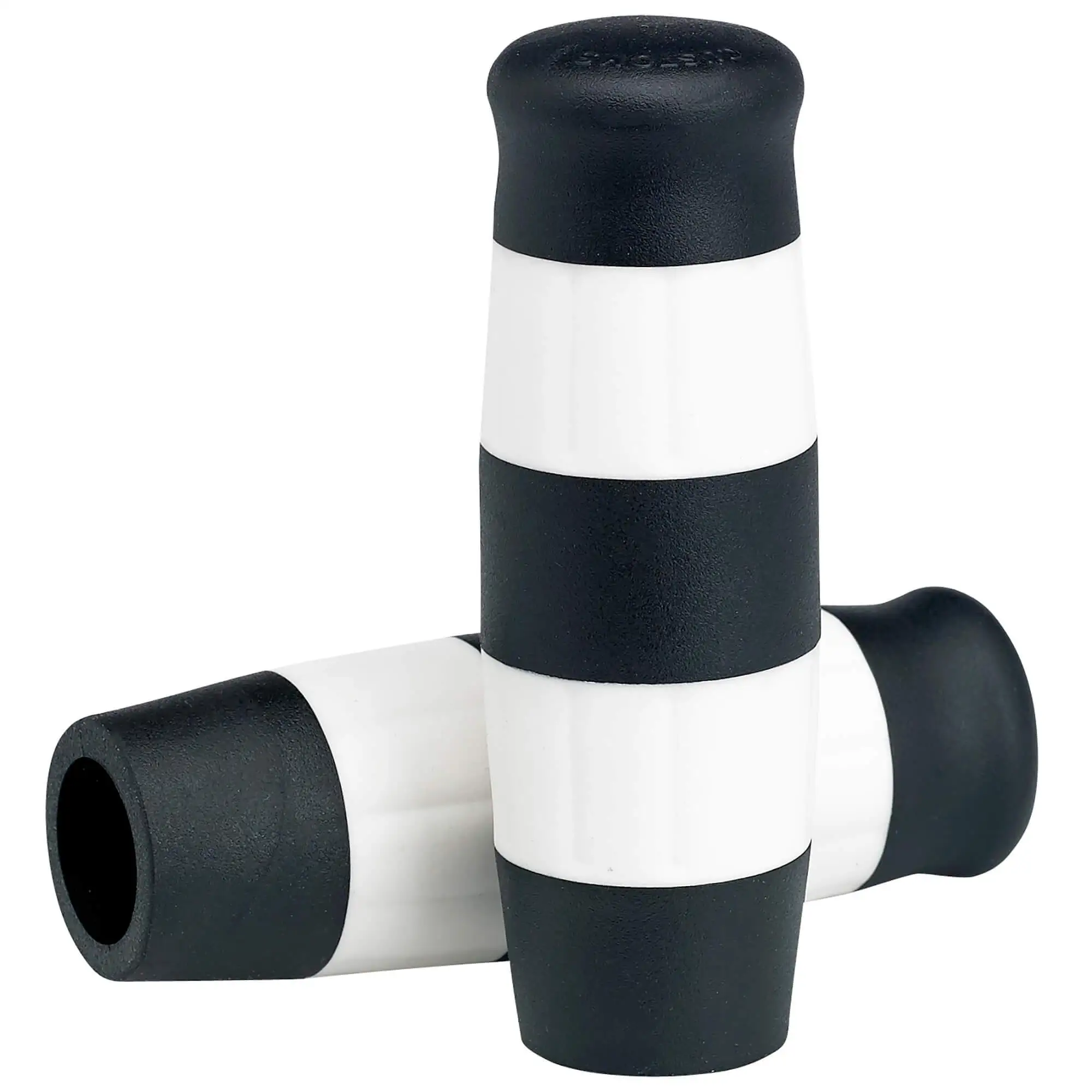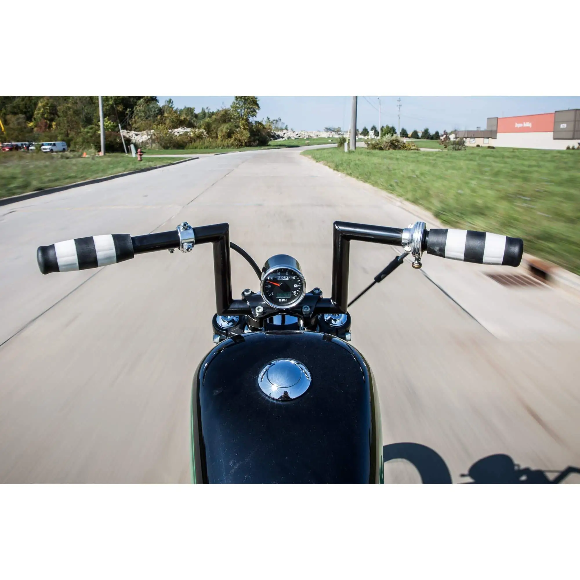 Black and White Stripes, for 1 inch handlebars. A penchant for old motorcycles and the devil’s lettuce leads to such advances as the alternating colored stripes that identify Flying Monkey Grips. Co-molded Krayton rubber and a comfortable radius that fits your hand like a glove add the form that follows function with this grip inspired by our good friend JD. Available in a multitude of colors for both 1″ and 7/8″ handlebars to please those on society’s fringe. Sold per pair. It is important to choose the proper size grips for your motorcycle. Grips are available in 1 inch (the size needed for all Harley-Davidsons and other ‘cruiser’ style motorcycles) as well as 7/8 inch (common on many vintage British, European and Japanese motorcycles such as Triumph, Honda and Yamaha). Please note that any pair of motorcycle grips has two different inside diameters. The grip for the left side (as if you were sitting on the bike) of the handlebar has a smaller diameter, and the right side grip has a larger inside diameter to fit over your throttle tube.