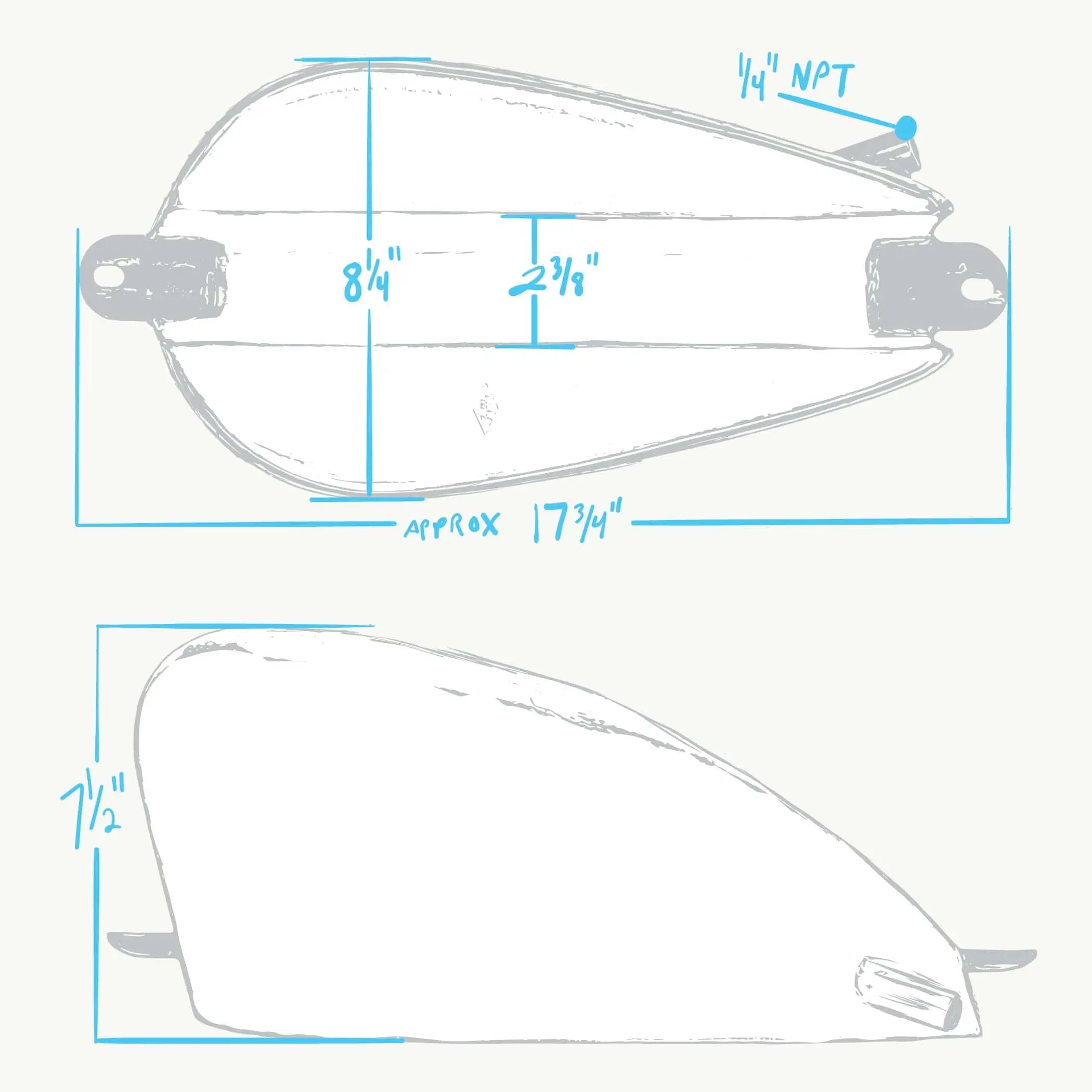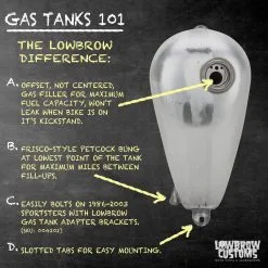 This is far superior to other Frisco Sportster style gas tanks that have a petcock bung on the flat bottom of the gas tank, as when your gas tank is mounted to your frame’s backbone it is at an angle, and this traps a lot of gas which cannot be used as it is below the petcock bung location. This design with the offset petcock bung on the very back of the tank allows you to use all the gas you can fit in there!