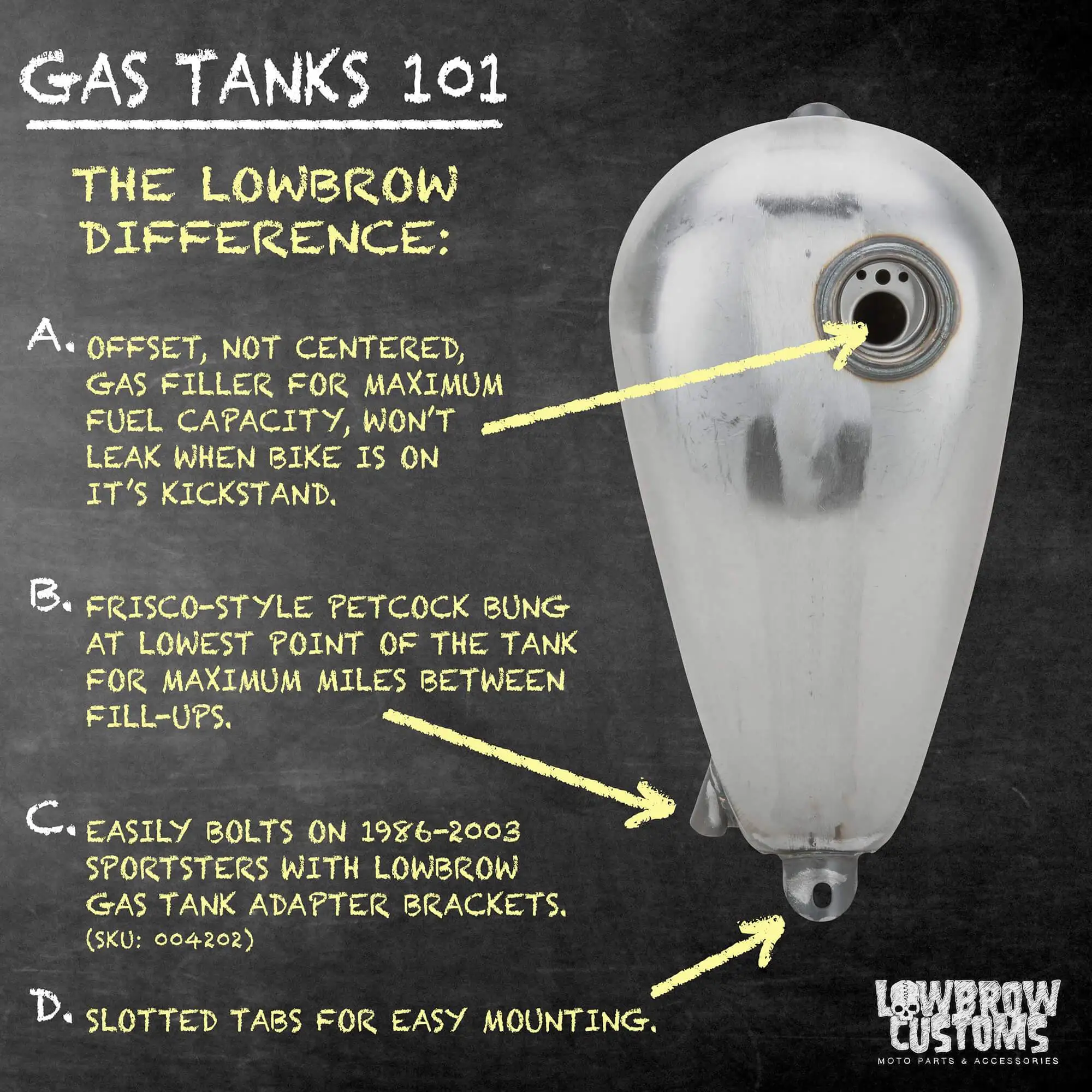 This Sportster Frisco mount gas tank will sit up higher on your backbone than the standard tank. These Narrow style, 2.1 gallon gas tanks are top quality, heavy gauge steel with an offset filler bung that accepts a thread-in