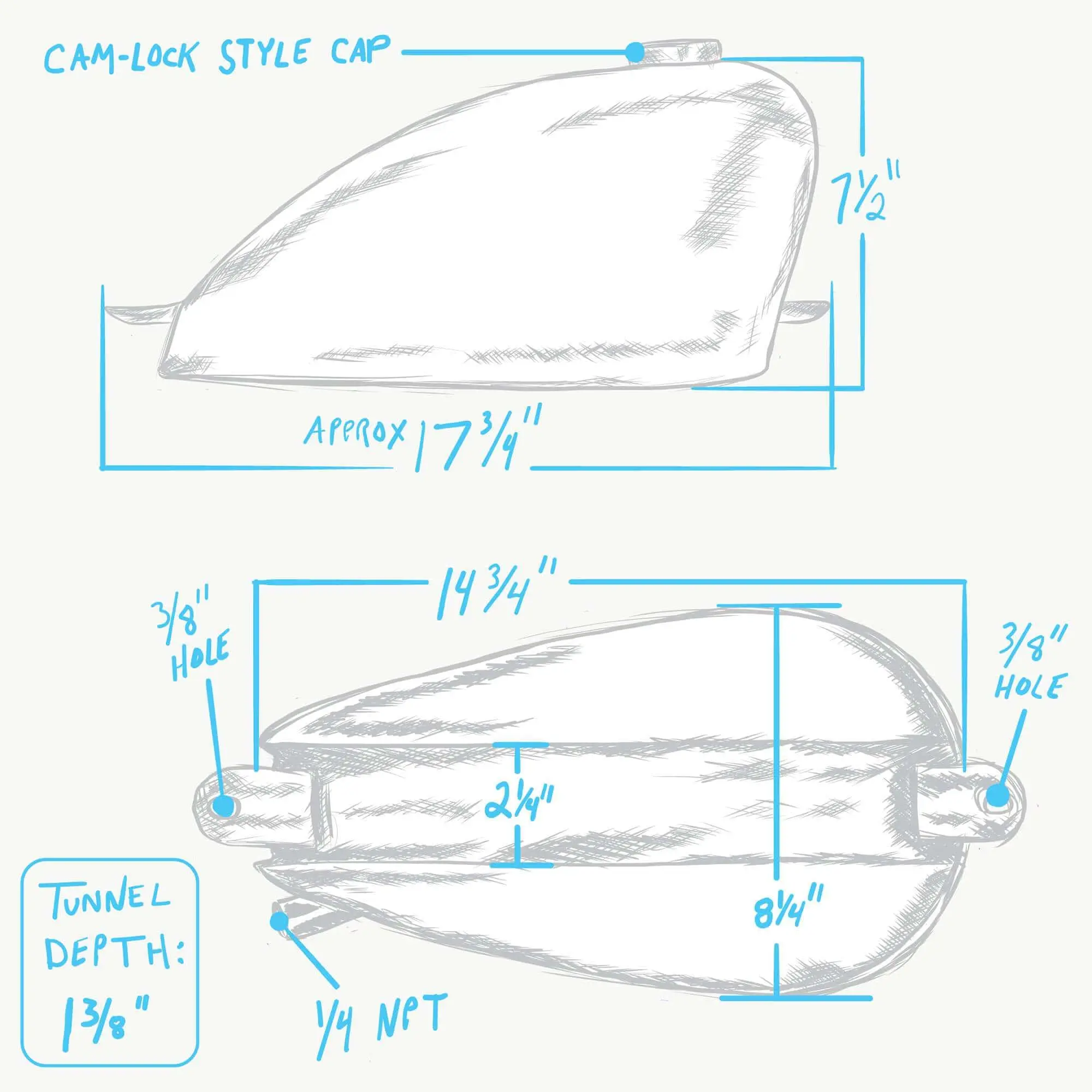 This is far superior to other Frisco Sportster style gas tanks that have a petcock bung on the flat bottom of the gas tank, as when your gas tank is mounted to your frame’s backbone it is at an angle, and this traps a lot of gas which cannot be used as it is below the petcock bung location. This design with the offset petcock bung on the very back of the tank allows you to use all the gas you can fit in there!