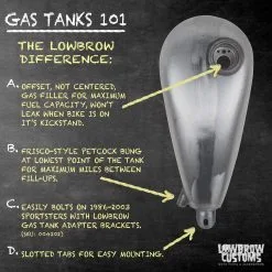 This is far superior to other Frisco Sportster style gas tanks that have a petcock bung on the flat bottom of the gas tank, as when your gas tank is mounted to your frame’s backbone it is at an angle, and this traps a lot of gas which cannot be used as it is below the petcock bung location. This design with the offset petcock bung on the very back of the tank allows you to use all the gas you can fit in there!