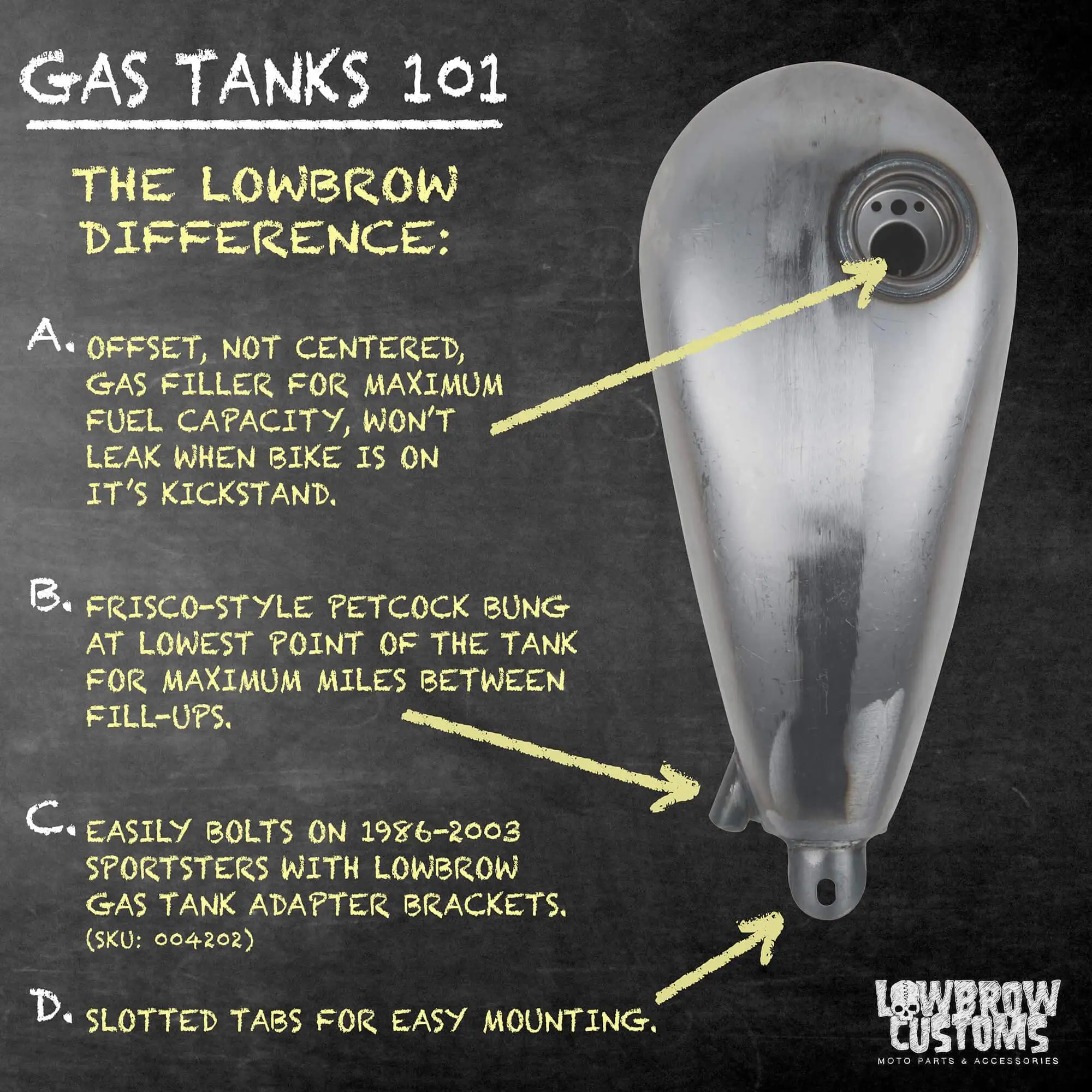 This Sportster Frisco mount gas tank will sit up higher on your backbone than the standard tank. These Super Narrow style, 1.6 gallon gas tanks are top quality, heavy gauge steel with an offset gas filler bung that accepts a thread-in