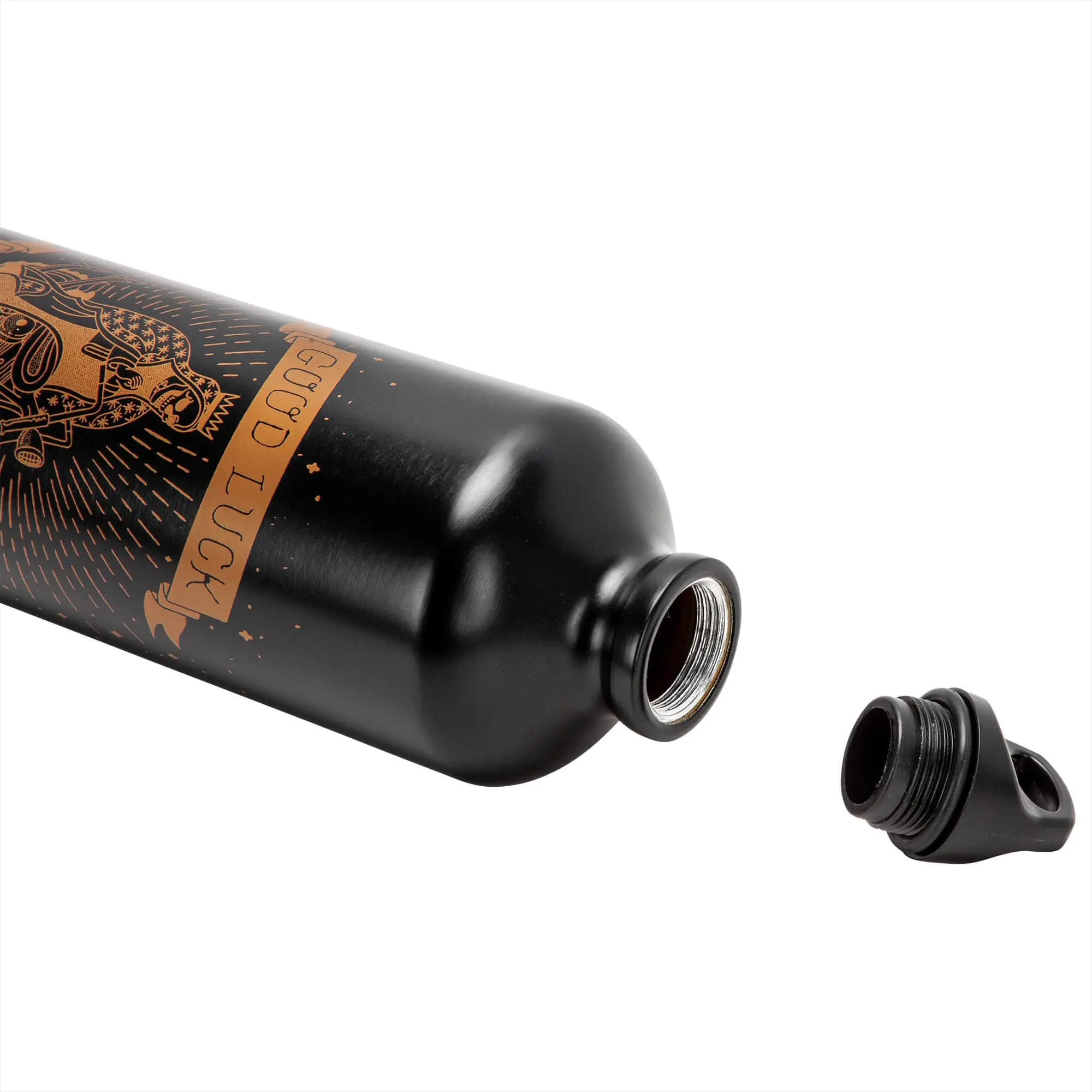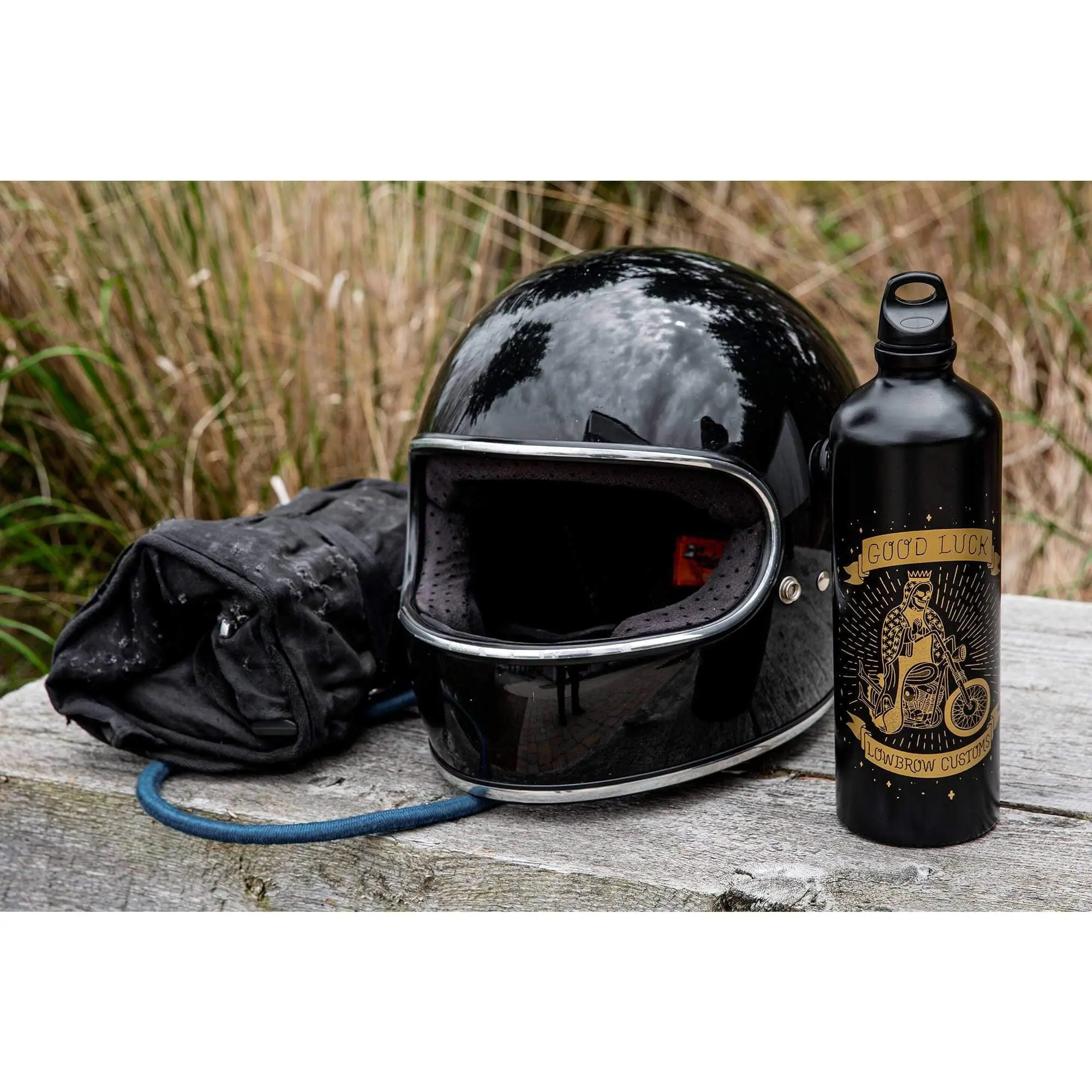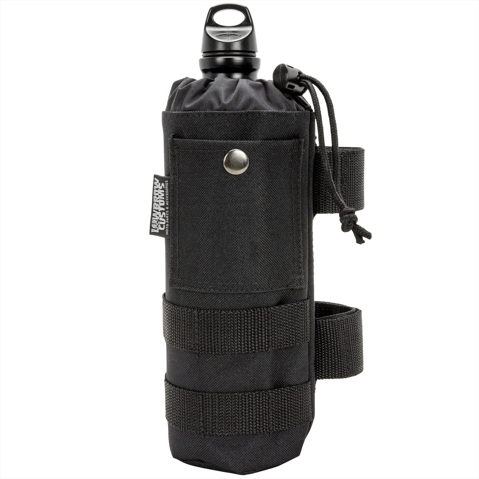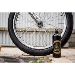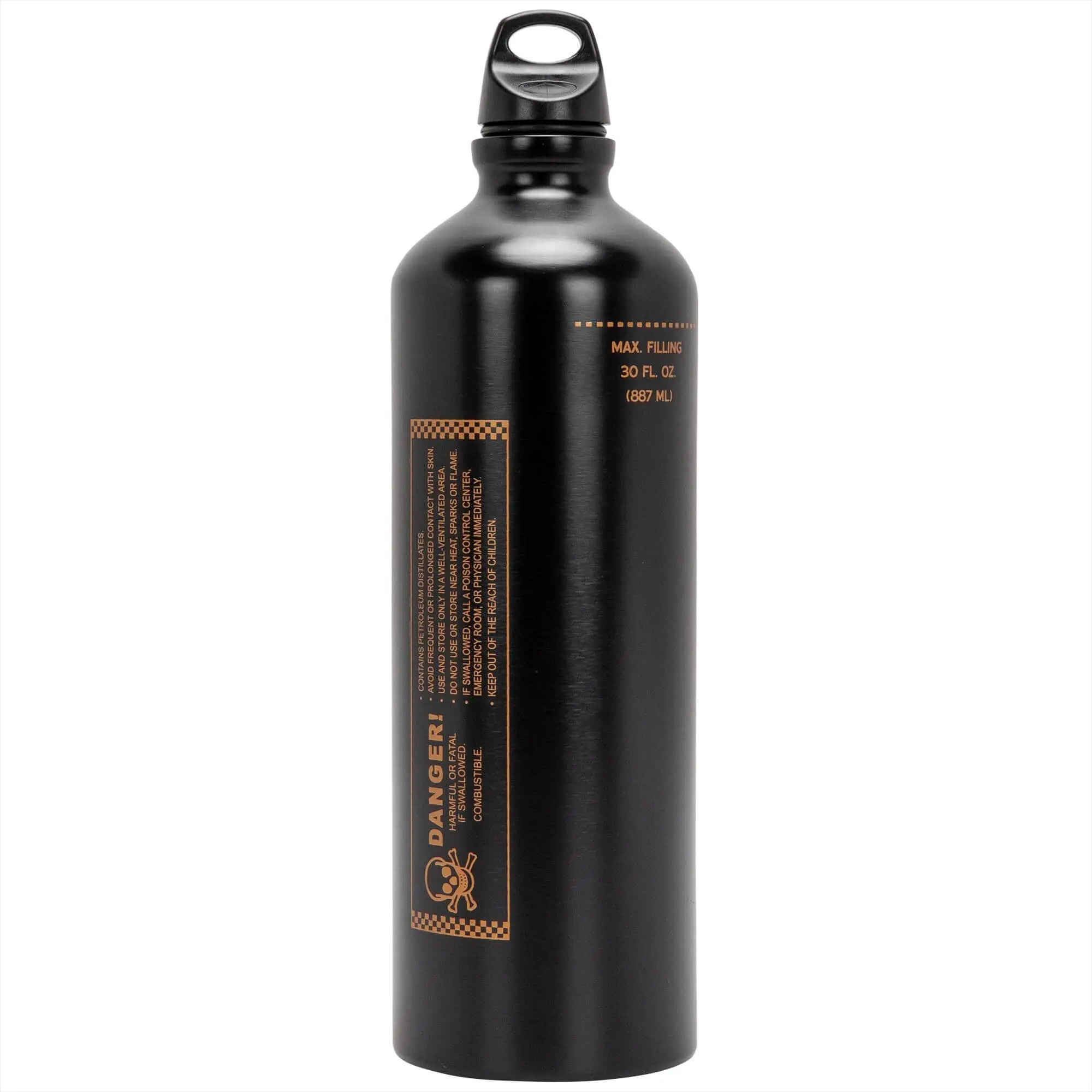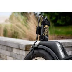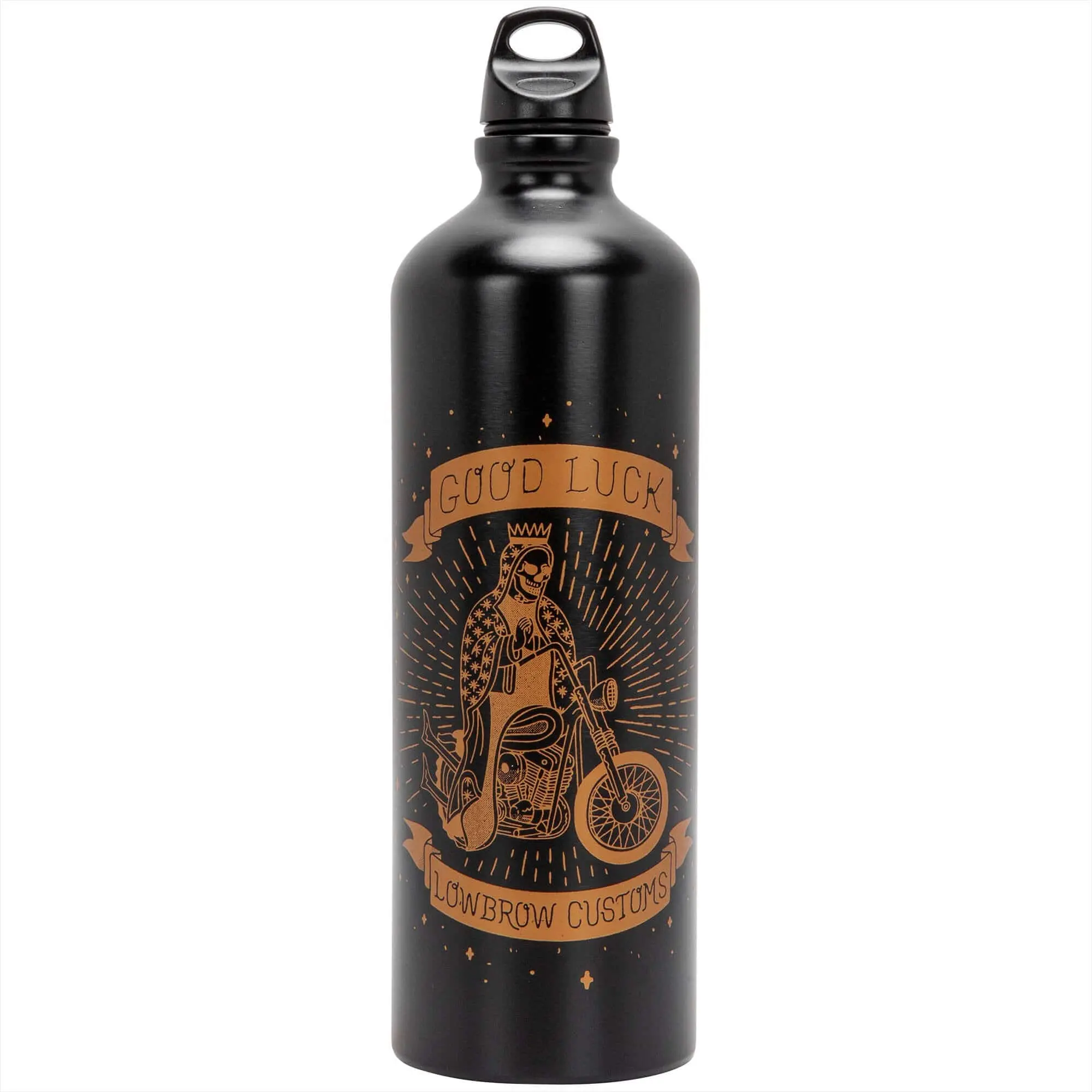The GOOD LUCK Lowbrow Customs Fuel Reserve Bottle is a classy satin black. Holds 30 fl. oz. (887 ml) of fuel. These are ultra light, seamless extruded aluminum. Lacquered interior for superior durability and protection. These are NOT water bottles! O-ring sealed cap. Height 10-5/8 inches and Diameter 3-1/8 inches. Note that the Fuel Reserve Bottle Carriers are sold separately, they are shown to illustrate different mounting options available.