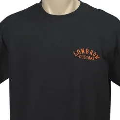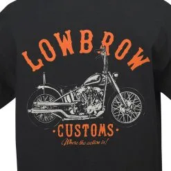 Lowbrow Customs, Where the Action Is! Lowbrow shop shirt featuring orange and discharge imprint on the back with a side profile of a super cool Knucklehead chopper. Left chest Lowbrow arched logo in matching orange. Rad. 100% cotton, black t-shirt for that vintage look and feel.