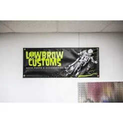 Every garage needs some style, add the Lowbrow Hellrider to your cave on this high quality banner. Measuring 42.75″ x 17″, and made from 10 oz. vinyl, these babies are weatherproof and are good for your shop or anywhere you feel the need. Double hemmed edges with brass grommets in each corner.