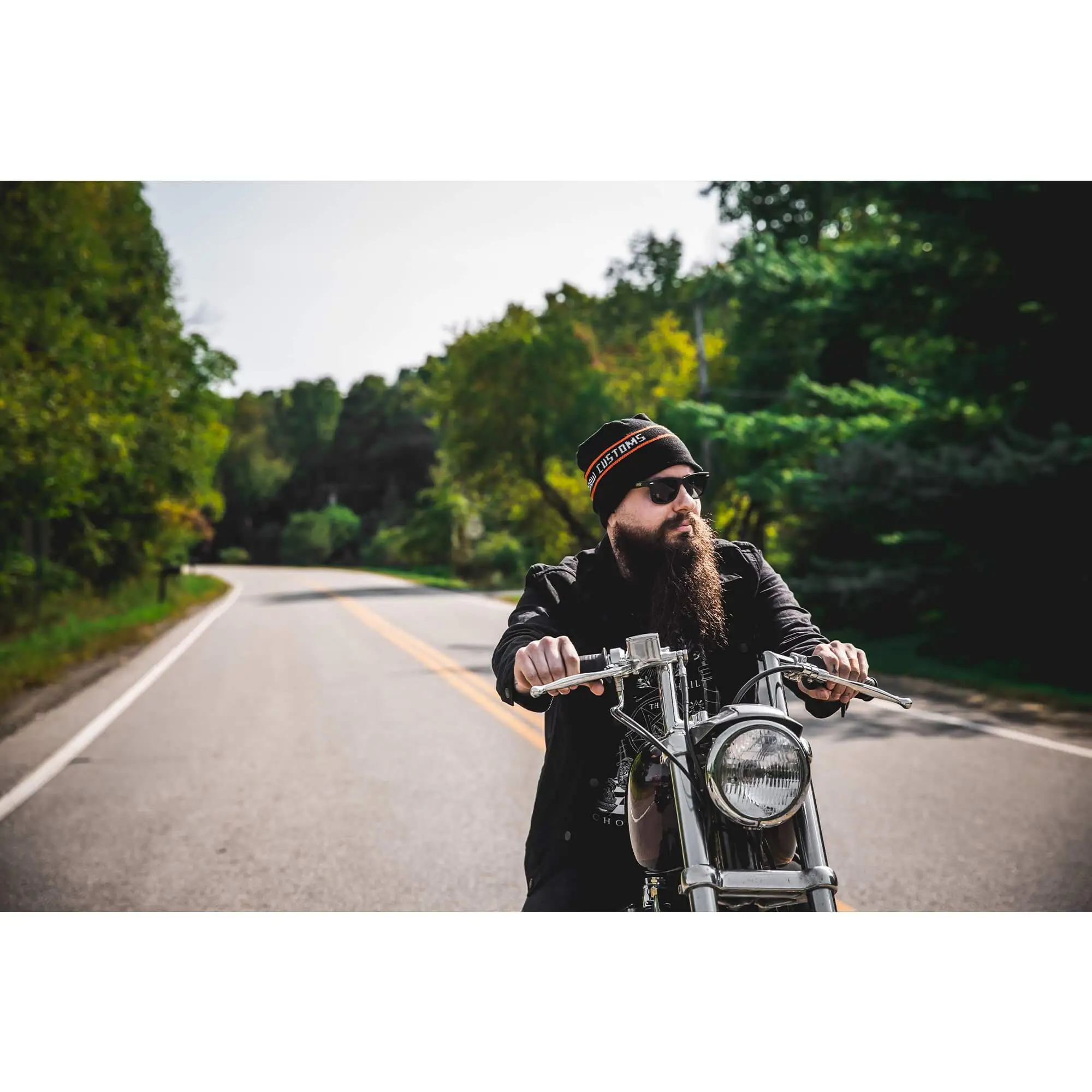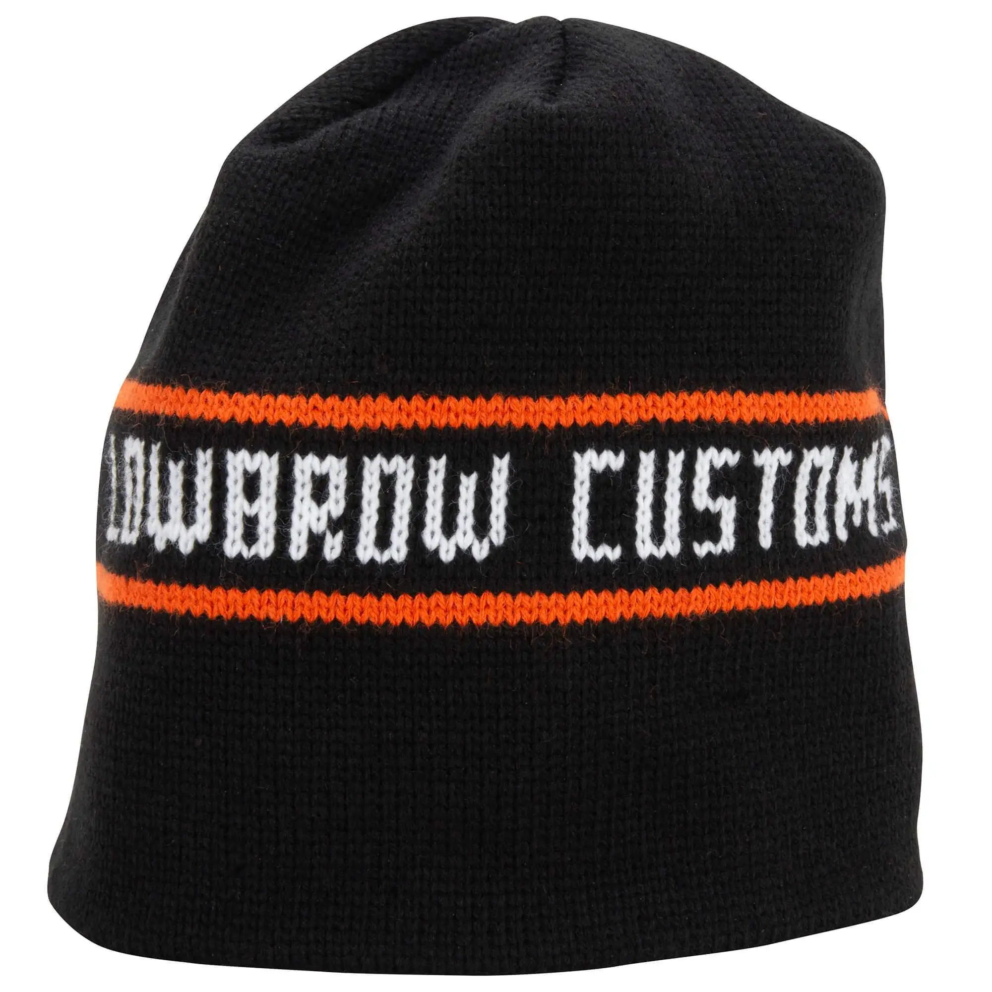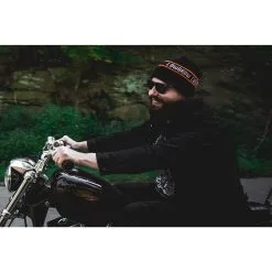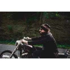 The Lowbrow Customs Motor Company knit hat is inspired by a hat ad found in the back of Easy Riders Magazine back in the 1970’s. The bearded young man in the original ad wearing the hat, with his ears being warmed with the help of a couple of ladies, happens to be our friend Frank Kaisler. 100% acrylic yarn. One size fits most. Made in the USA.