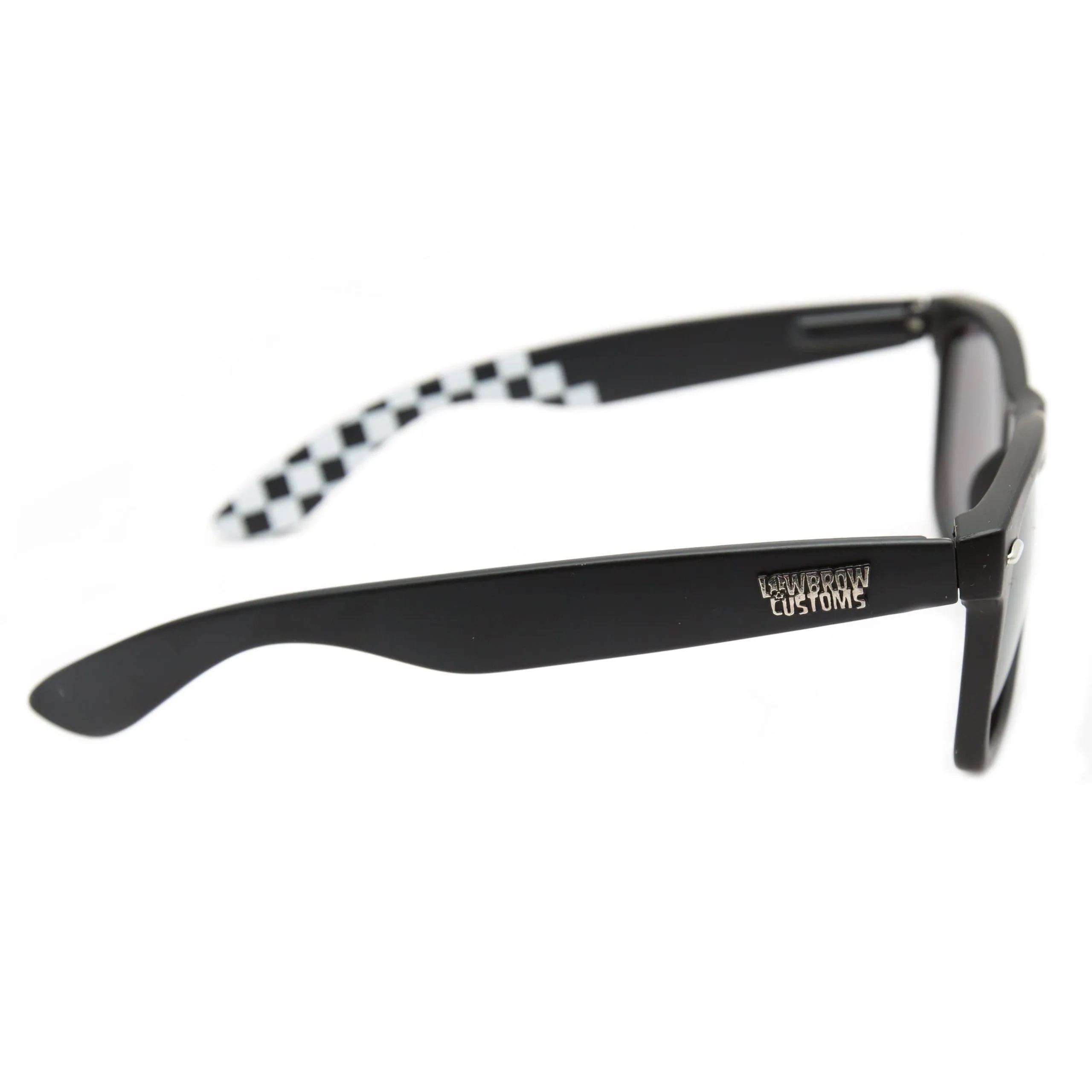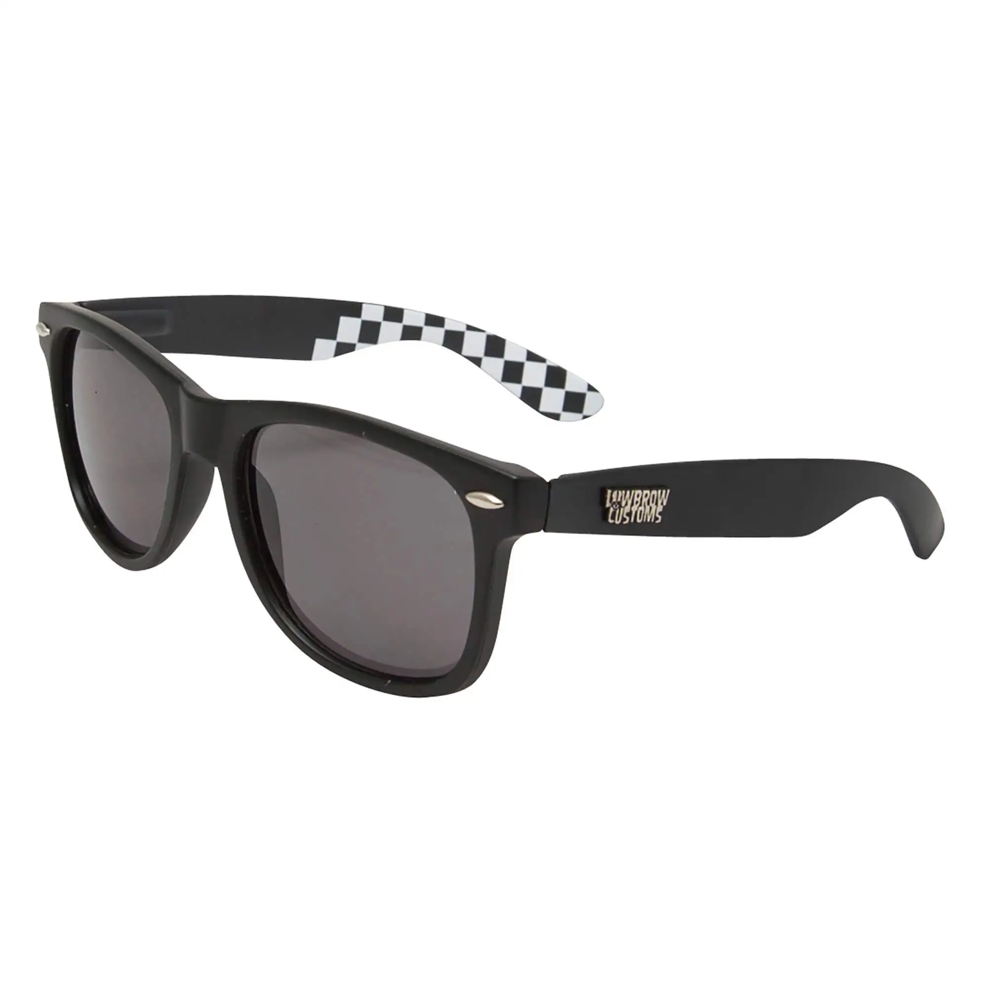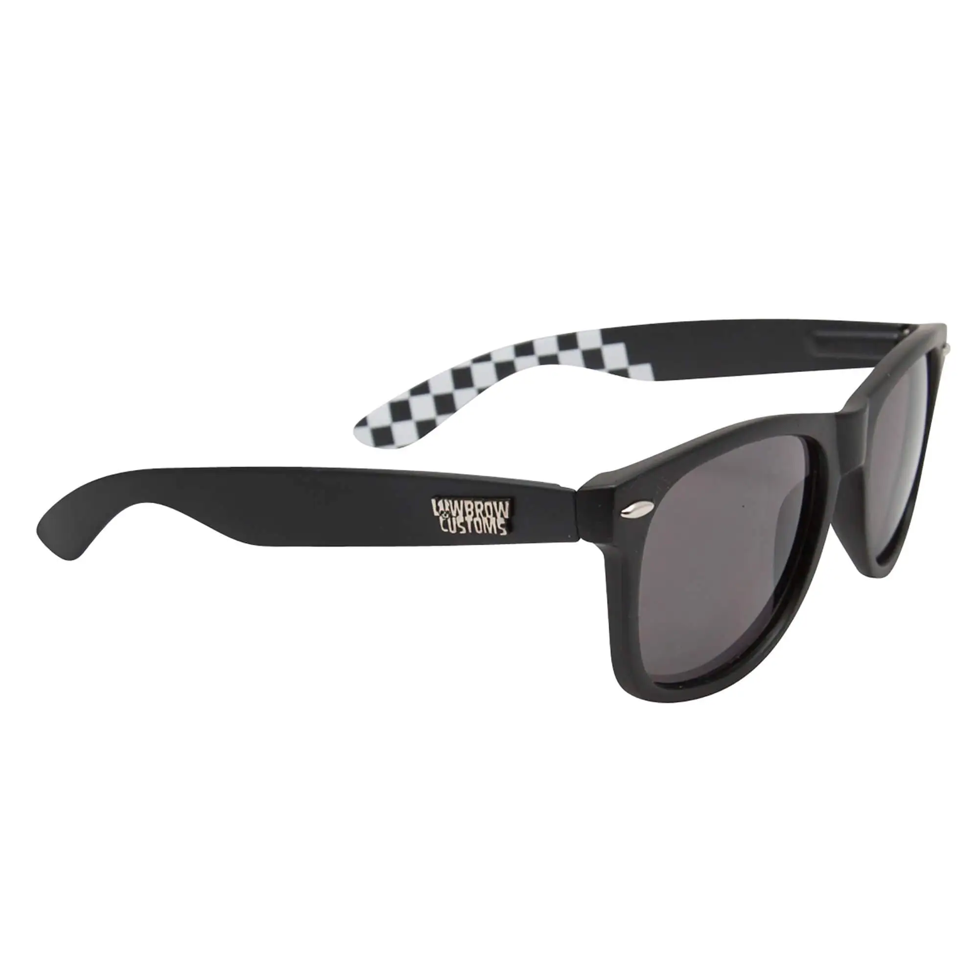 Lowbrow Customs sunglasses are ideal for riding your moto or jamming around town, regardless of mode of transport. They hold up to the daily rigors of the average 21st century S.O.B. while remaining reasonably-priced and oozing classic style. Quality touches like articulated spring hinges, small, raised Lowbrow Customs logos, and a subtle checkerboard imprint on the inside of the arms add style to substance. Micro-fiber storage pouch included. Flat black polycarbonate frame with UV400 dark grey polycarbonate lenses.