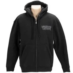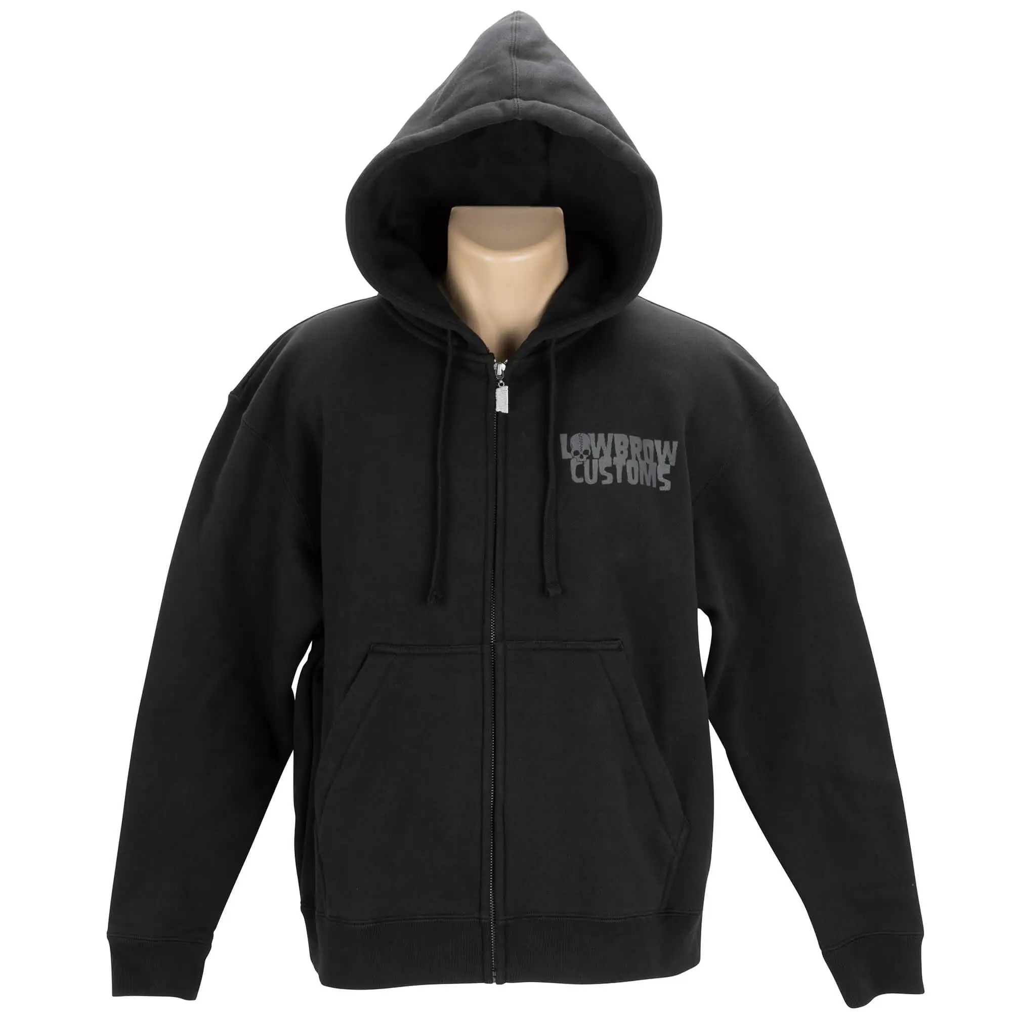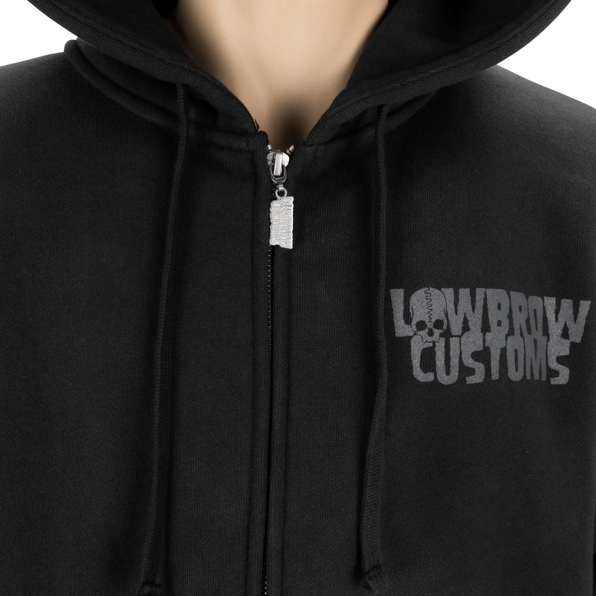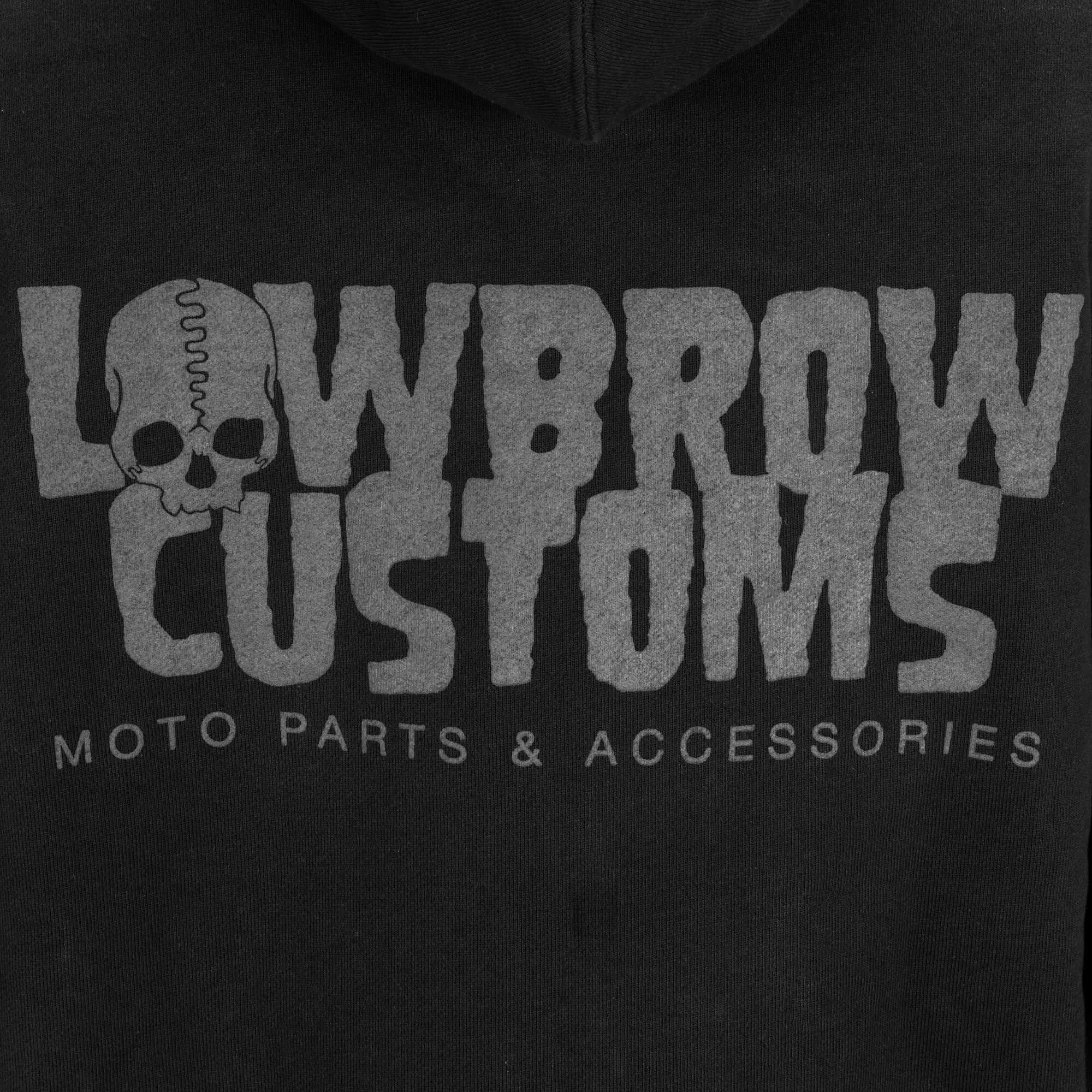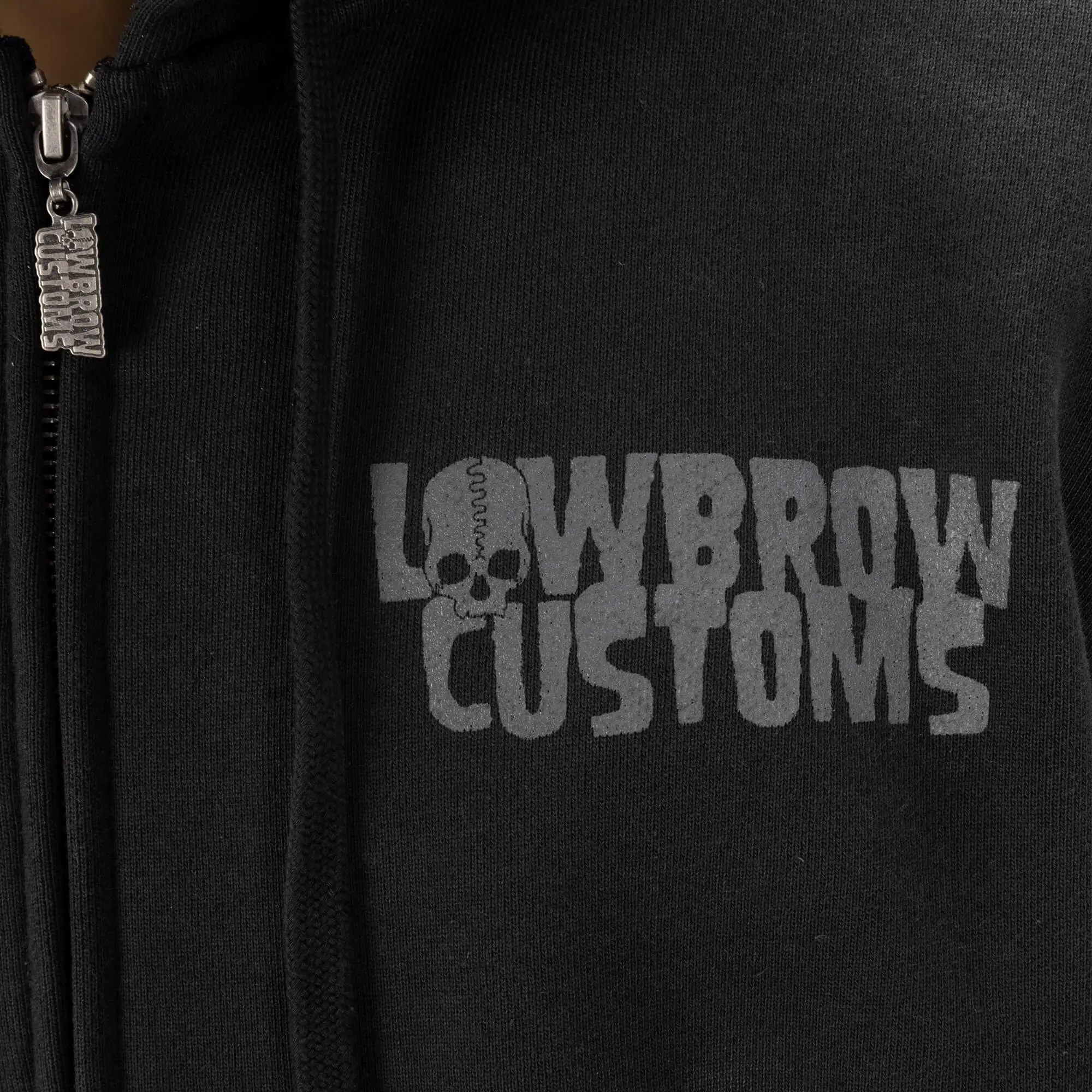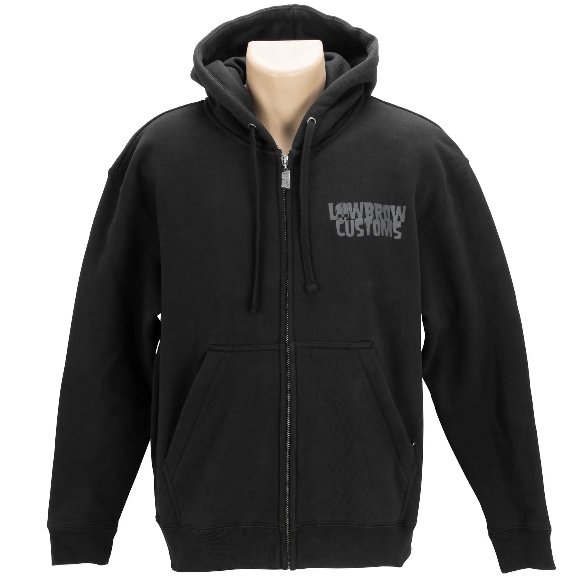 The Lowbrow Customs Blackout Hooded Sweatshirt is not your typical hoodie. This heavy-duty sweatshirt was designed by riders for riders and is built to last for years. This heavy sweatshirt is made from a heavy weight (16 ounce!) 70/30 cotton/poly blend and features double-stitching throughout. 1” ribbing on the waist and arm cuffs to help keep it from riding up when riding.