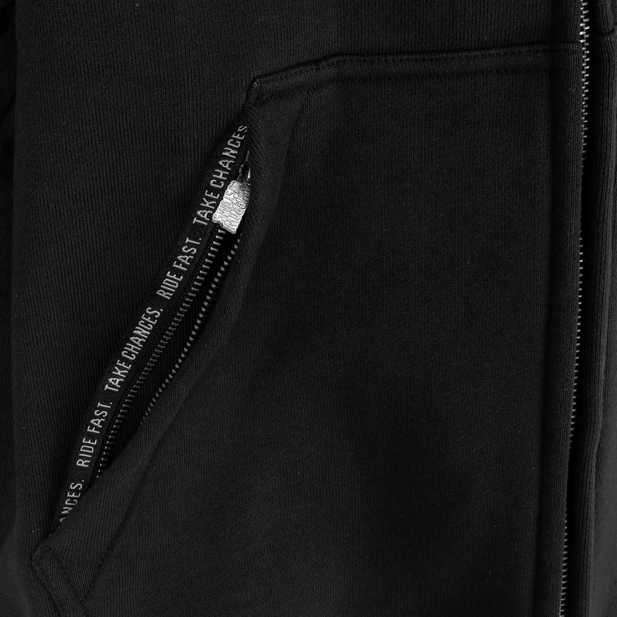 The sleeves have been slightly lengthened so your arms remain covered when in the riding position on your bike. Cut slightly shorter in the waist so it doesn’t bunch up while you ride. All the custom metal zippers and pulls were designed to be easily operated with gloves on. The pocket zippers close in the downward position so you don’t lose your stuff when you ride. Fleece lined hood with nickel eyelets and custom “Ride Fast Take Chances” pocket tape. Super comfortable, heavy-weight and durable. Guaranteed to be a favorite choice for your casual or riding wear.