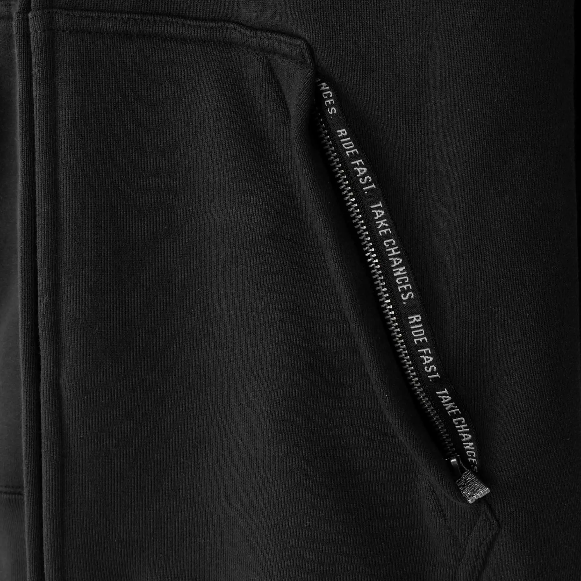 The sleeves have been slightly lengthened so your arms remain covered when in the riding position on your bike. Cut slightly shorter in the waist so it doesn’t bunch up while you ride. All the custom metal zippers and pulls were designed to be easily operated with gloves on. The pocket zippers close in the downward position so you don’t lose your stuff when you ride. Fleece lined hood with nickel eyelets and custom “Ride Fast Take Chances” pocket tape. Super comfortable, heavy-weight and durable. Guaranteed to be a favorite choice for your casual or riding wear.