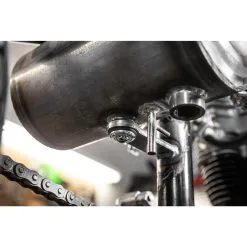 , and can be used on any motorcycle that has a vertical seat post. The included brackets are 1/4 inch thick mild steel and feature our innovative tophat spacers, 3 chrome button head allen 5/16″ X 18 TPI fasteners and rubber grommets to keep vibration from causing any damage to your oil tank or mounts. Both mounts are coped for the Triumph frame’s seat post tube. Bolt this mounting kit to your oil tank, hold in place against your frame and apply a number of tack welds to hold the brackets in place. Unbolt your oil tank so you can finish weld your brackets. That is it! Made in Ohio, USA.