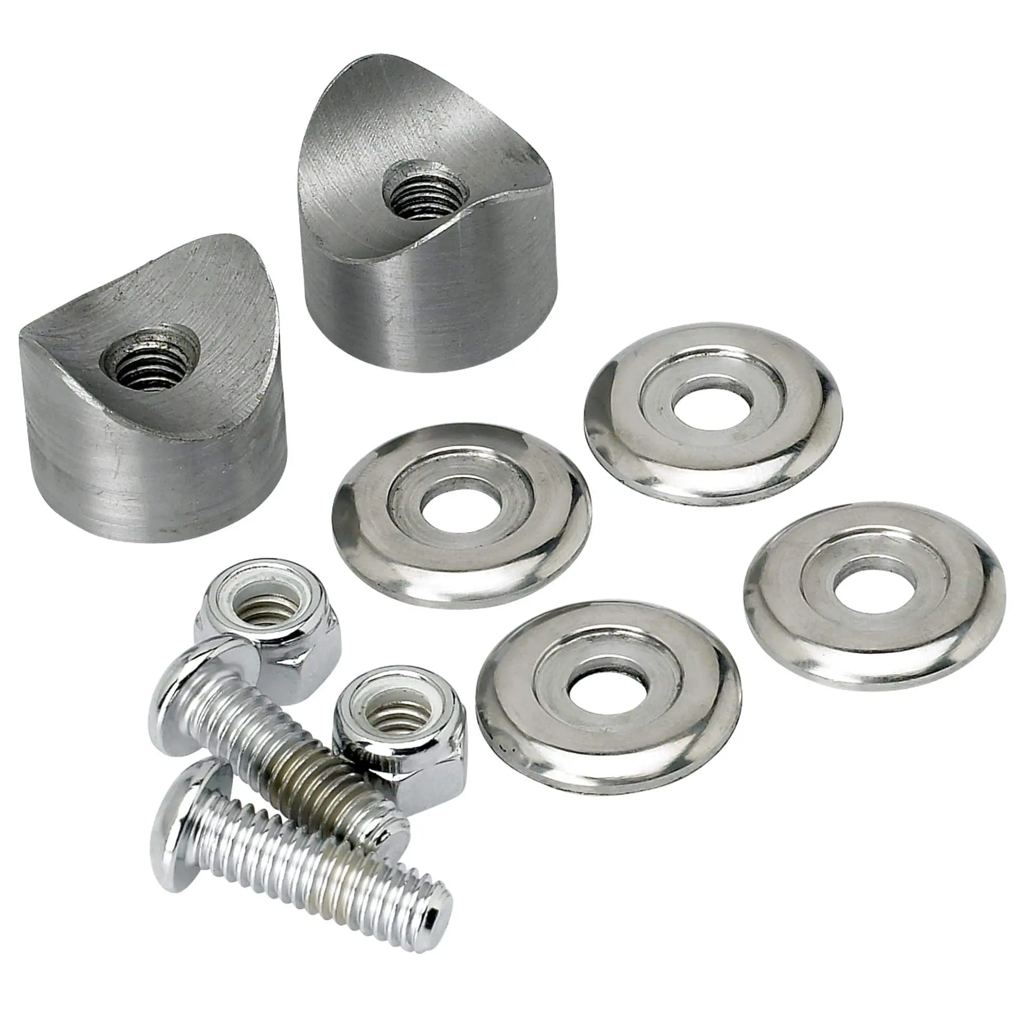 The bungs can be welded on to your frame at any angle, dependent on how much of a kick-up your solo seat has in the rear. A set of stainless washers and the chrome button head allen bolts hold the springs in place, while another set of stainless washers and the chrome nylock nuts attach your springs to your seat.