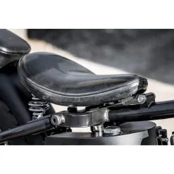 The Lowbrow Customs Solo Seat Pivot is made right here in Cleveland, Ohio. Heavy-duty stainless steel that is tumbled for a beautiful finish paired with custom-made, chrome plated mounting hardware and a raw, mild-steel, weld-on pivot block that is coped for a 1.25 inch diameter frame backbone. You can easily open up the radius of the pivot block with your grinder to fit other diameter frame backbones, or cut if off flat if welding to a flat mounting surface. The design of this solo seat pivot is such that it allows your seat to sit down nice and low to your frame’s backbone, tucking it in nice and tight. Pair this with your choice of