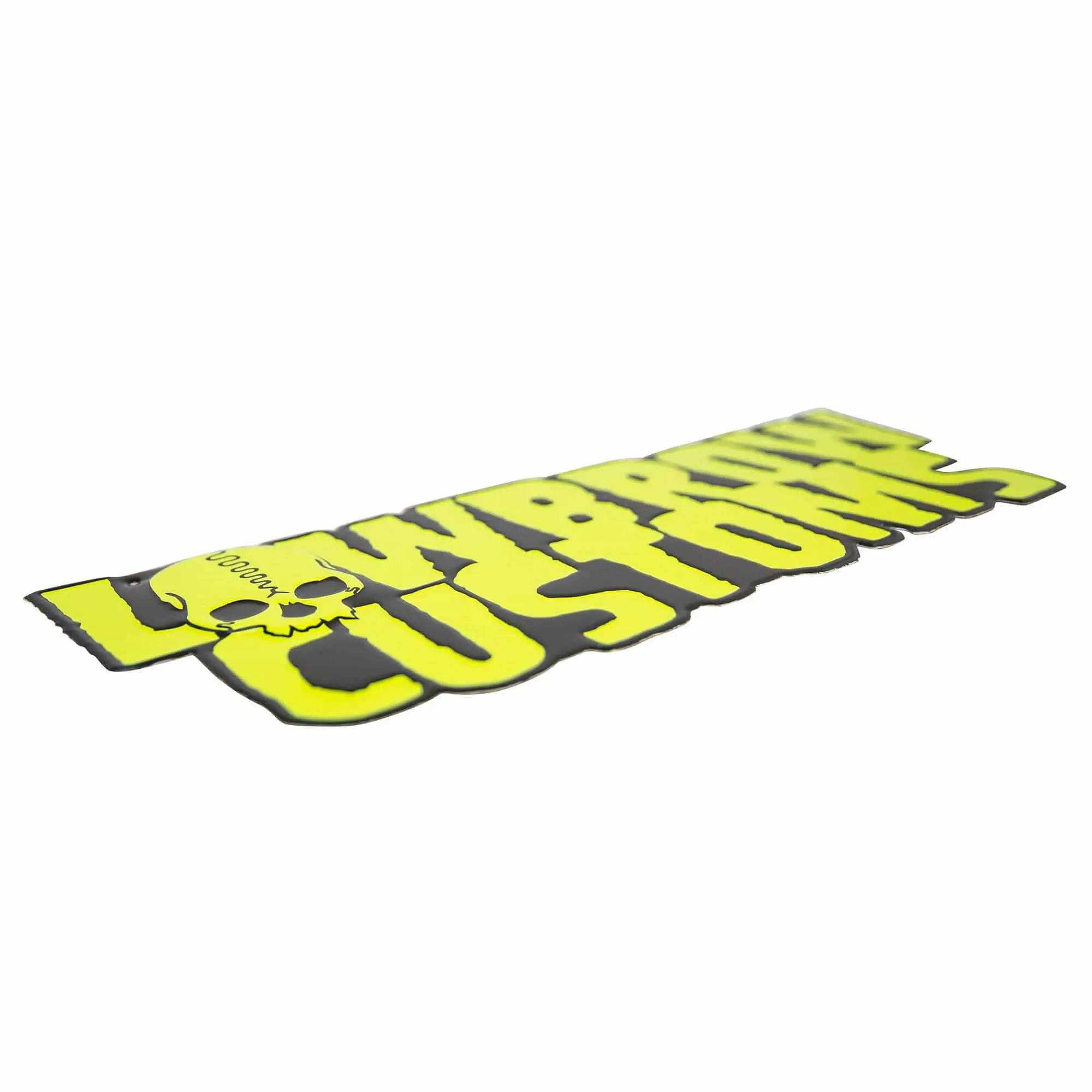Advertise the fact that you live the Lowbrow lifestyle with a stamped aluminum Lowbrow Customs shop sign hanging on your wall. 7″ wide and 17 1/2″ length aluminum sign in our trademark lime green and black. Made in the USA.