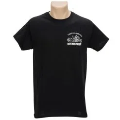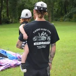 Do you enjoy working on your bike into the wee hours of the morning and drinking beer in the backyard with your chopper bros? Chances are this is what your neighbors thought when you moved in. Get one for yourself or buy one for Joe next door as a peace offering. Full back imprint, with a left chest logo. 100% cotton, black t-shirt for that vintage look and feel.