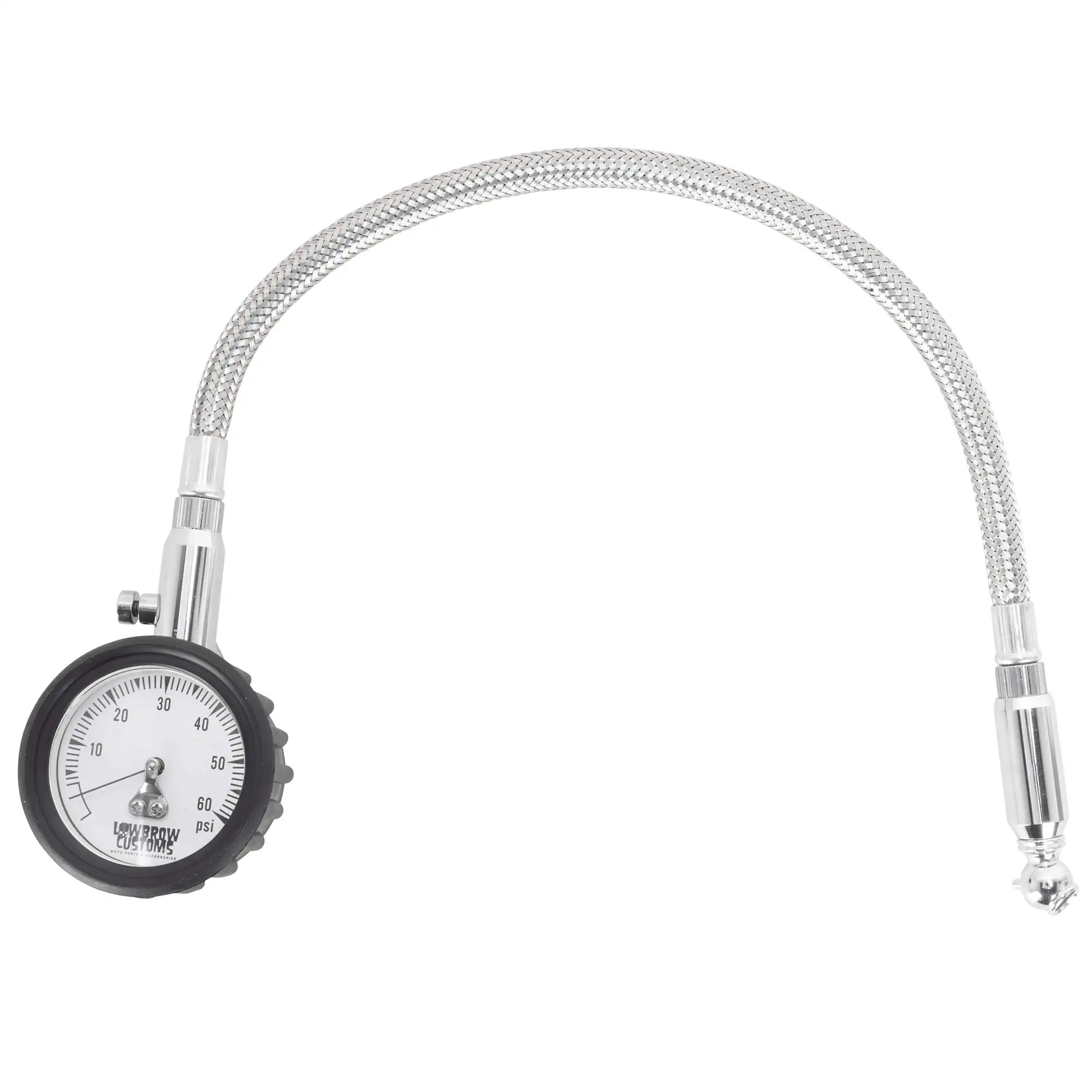 The Lowbrow Customs Tire Gauge has a 2″ gauge face, a 12” stainless-steel braided hose, and a steel body. The 45° angle chuck swivels and will help you get into those tight spots and the rubber casing will help protect the gauge from impact damage. This 0-60 PSI tire pressure gauge also features a push button pressure release valve which makes checking and filling your tires quick and easy.