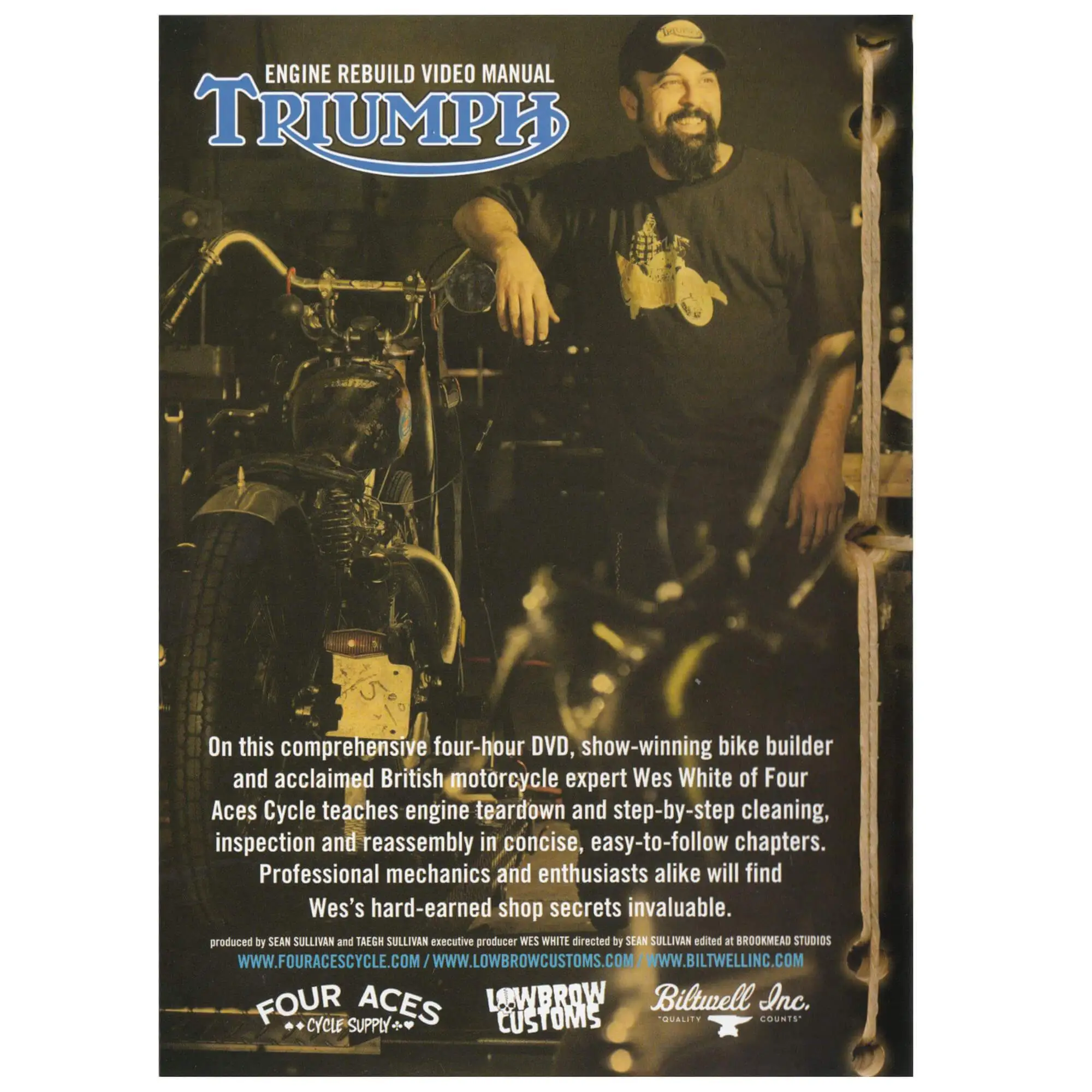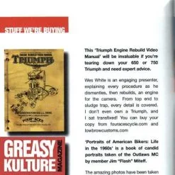 for that next engine rebuild project: On this comprehensive four-hour dvd, show-winning bike builder and acclaimed British motorcycle expert Wes White of Four Aces Cycle teaches engine teardown and step-by-step cleaning, inspection and reassembly in concise, easy-to-follow chapters. Professional mechanics and enthusiasts alike will find Wes’s hard-earned shop secrets invaluable. Not only is this DVD perfect for your 650 c.c. or 750 c.c. Triumph motor, it is also very helpful for rebuilding your 500 c.c. or Pre Unit motor as well! The Triumph 650 Rebuild DVD has received rave reviews, in the gallery to the left are just a few from Greasy Kulture, Back Street Heroes and Cafe Racer magazines.