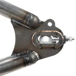 The entire rear motor mount area is designed to be as strong as possible and will handle any motor no matter how built. The rear motor mount bolts are very easy to access with our unique design, which adds to the ease of installation. Rear axle plates have doublers welded in place so the rear axle is a perfect fit (and also looks great). The doublers have another purpose, which is that they are the only spot your axle head and axle nut touch on the frame, saving the rest of the frame’s paint when adjusting the rear wheel and chain. Integrated in the axle plate design are convenient 3/8 inch holes for rear fender struts. Each hardtail includes a set of axle adjusters that will work with stock 3/4 inch rear axles. The adjusters tuck in behind the axle plates, keeping them hidden, and they are adjusted from the rear of the axle plate. This is very similar to an Ironhead Sportster setup, which allows the rear wheel and chain to be adjusted with ease while keeping everything copasetic.