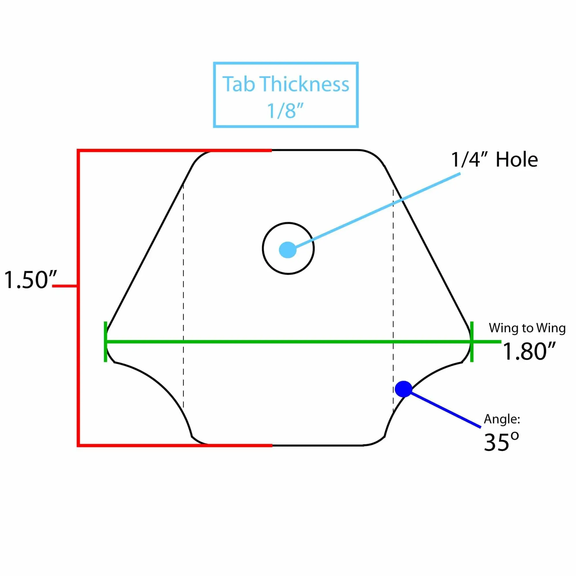 Wing Tabs are made from 1/8″ cold rolled mild steel, CNC laser cut with a 5/16 hole, but with enough material to drill out to a larger size. The bent gussets add substantial strength to this welded tabs in comparison to standard flat tabs, and fit most any diameter tubing.