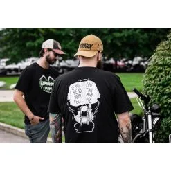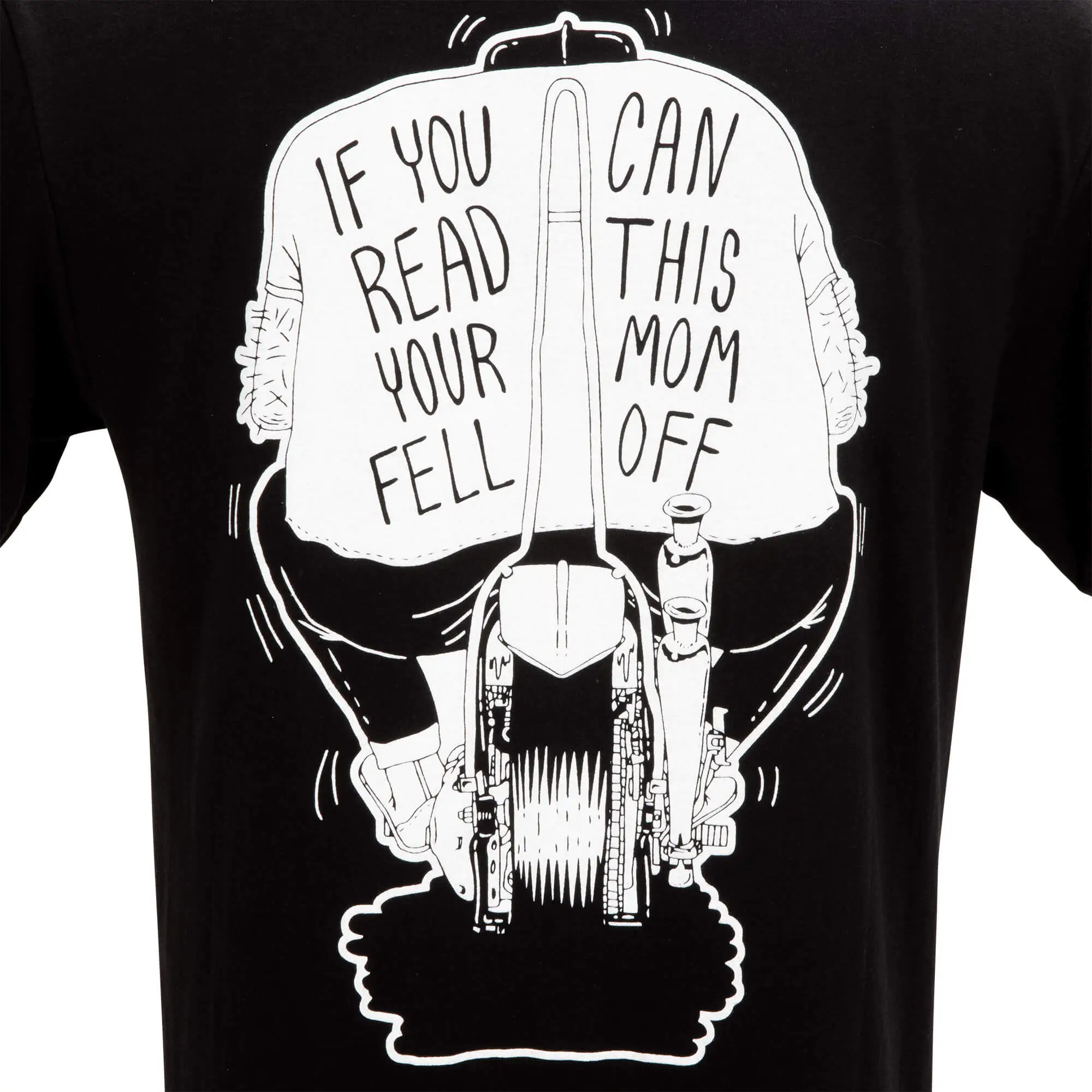 Your Mom Fell Off T-Shirt. Full back imprint, with a left chest logo. Premium, soft, 100% cotton black t-shirt for that vintage look and feel.